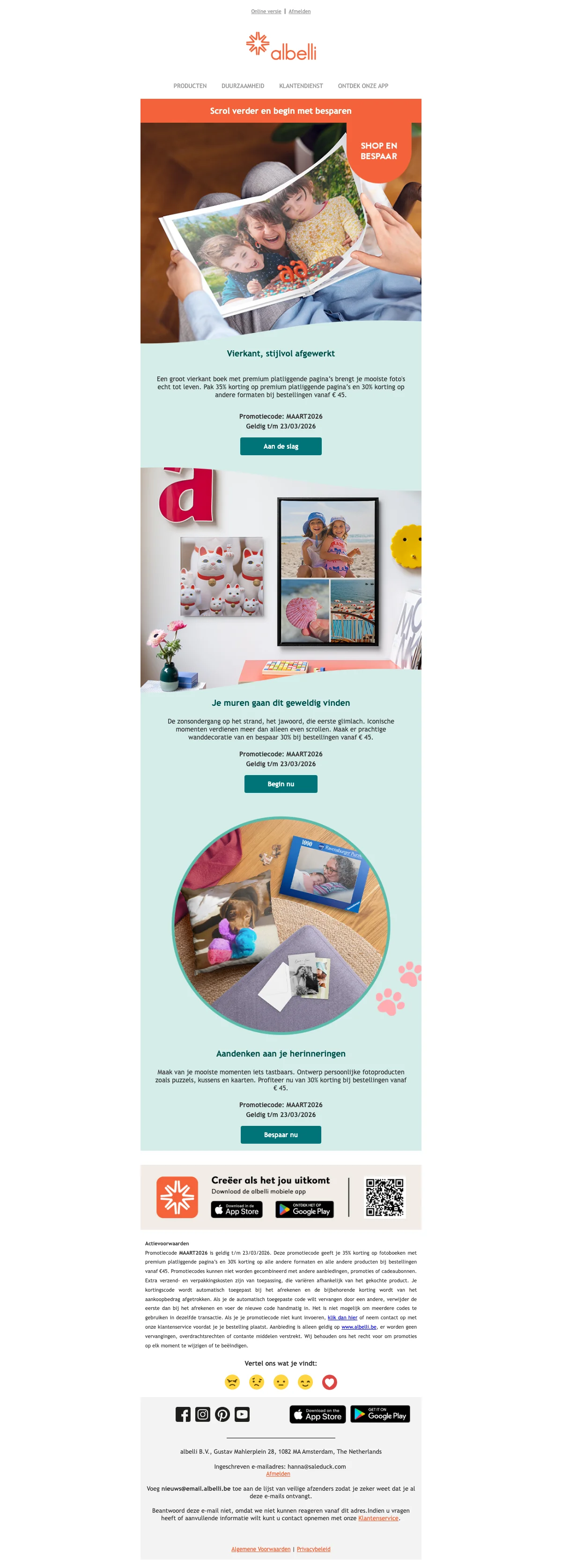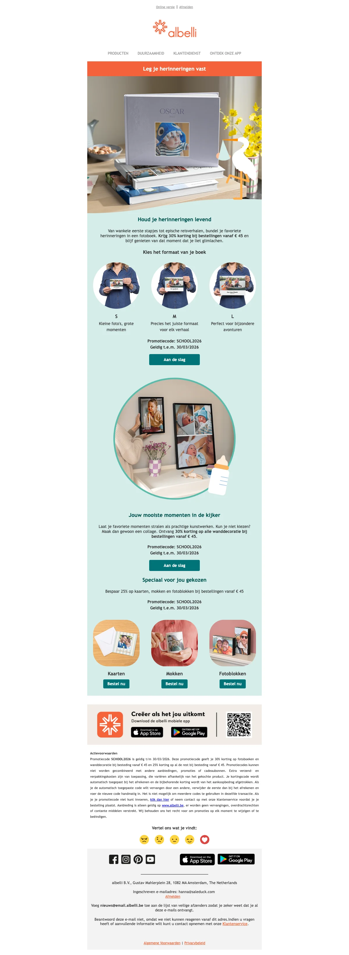 | SCHOOL2026 | Albelli fotoboeken 30% korting bij bestellingen vanaf €45 |
