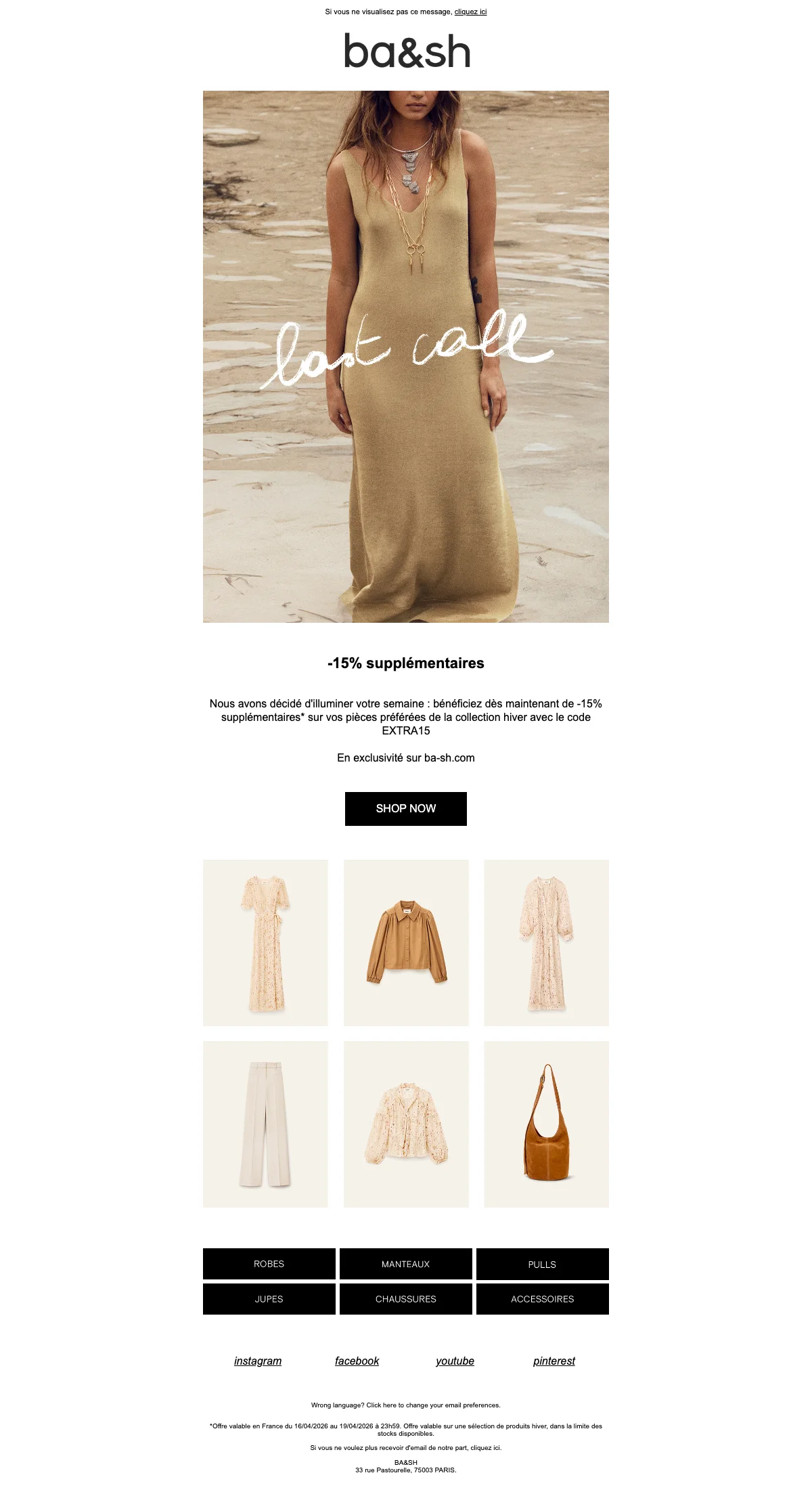De werkende ba&sh kortingscode is EXTRA15. Vul deze promocode voor ba&sh 2026 in op de afrekenpagina en ontvang exclusieve kortingen. Ba&sh extra korting winter -15% korting op geselecteerde items.