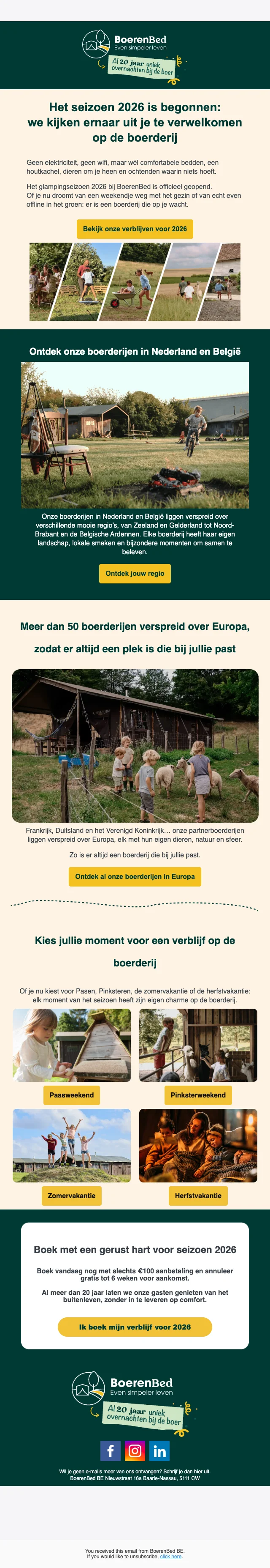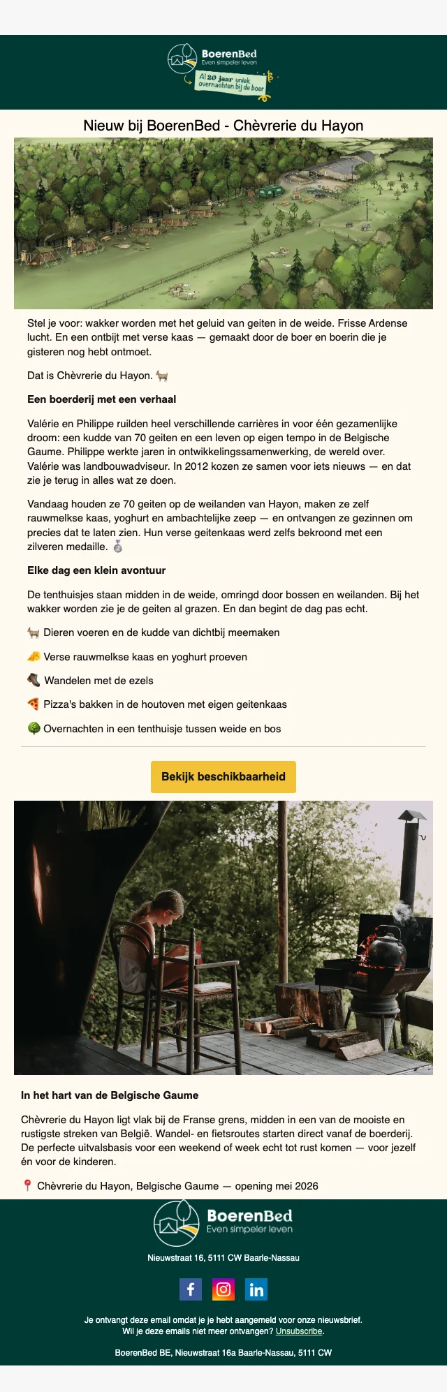Verlang je naar een break van de dagelijkse technologie? Onze Tenthuisjes op Boerenbed locaties in België laten je leven zoals vroeger voor een weekend. Onthaast in de serene ambiance van het platteland en laat de boerderijdieren je hart verwarmen. Ideaal voor families of stellen die samen even helemaal bij willen komen.