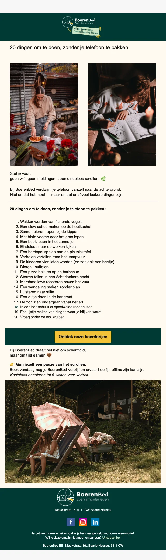 Ervaar het eenvoudiger leven zonder elektriciteit en moderne technieken in een authentiek Tenthuisje van Boerenbed. Ontdek de charme van het wonen op een echte boerderij in België, en geniet van de rust en gezelligheid met het hele gezin. Perfect voor diegenen die op zoek zijn naar een unieke vakantie-ervaring waarbij je teruggaat in de tijd.