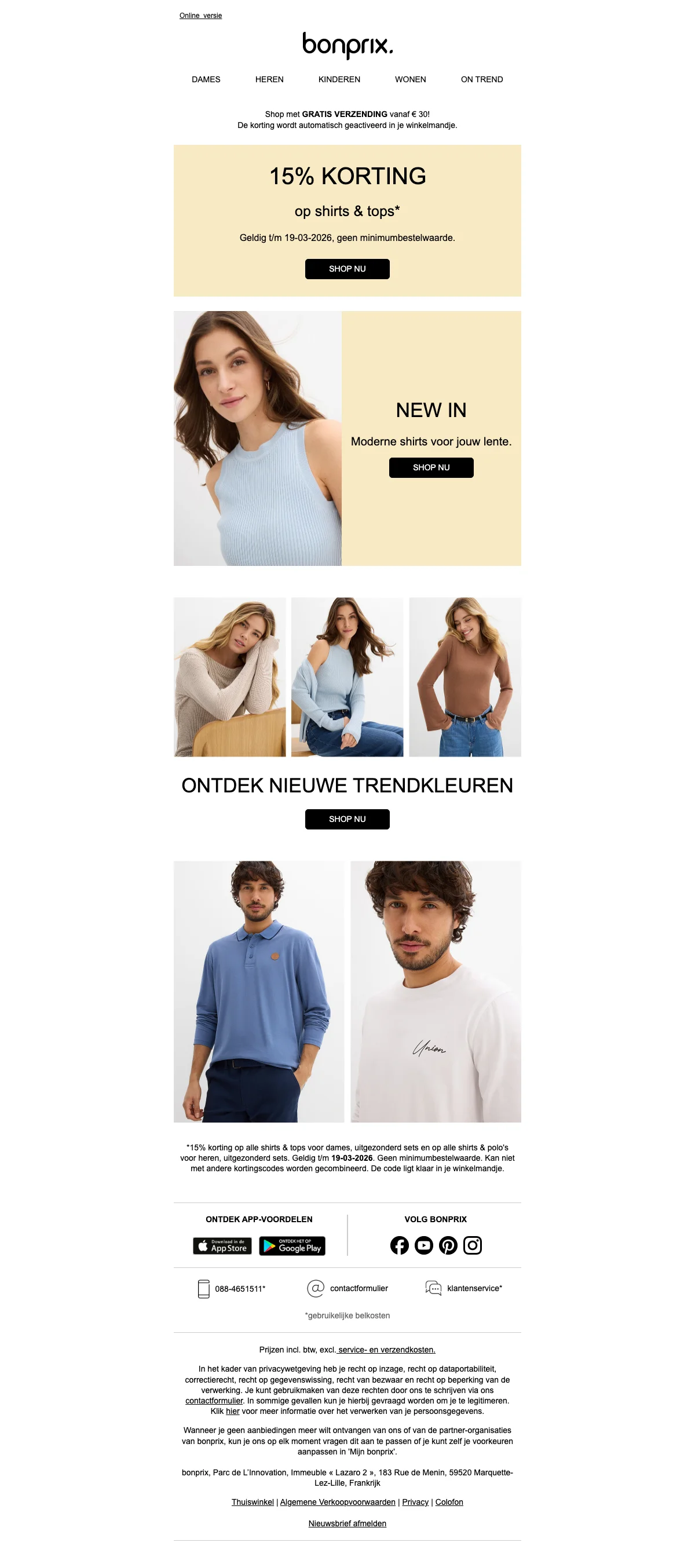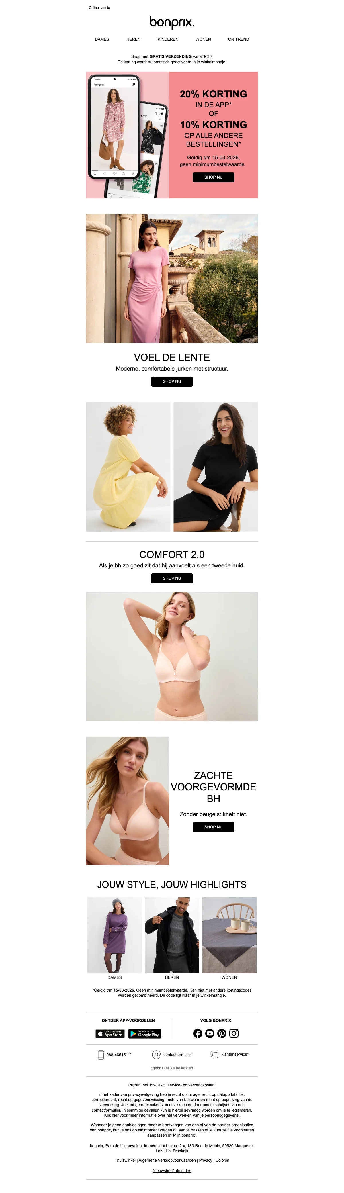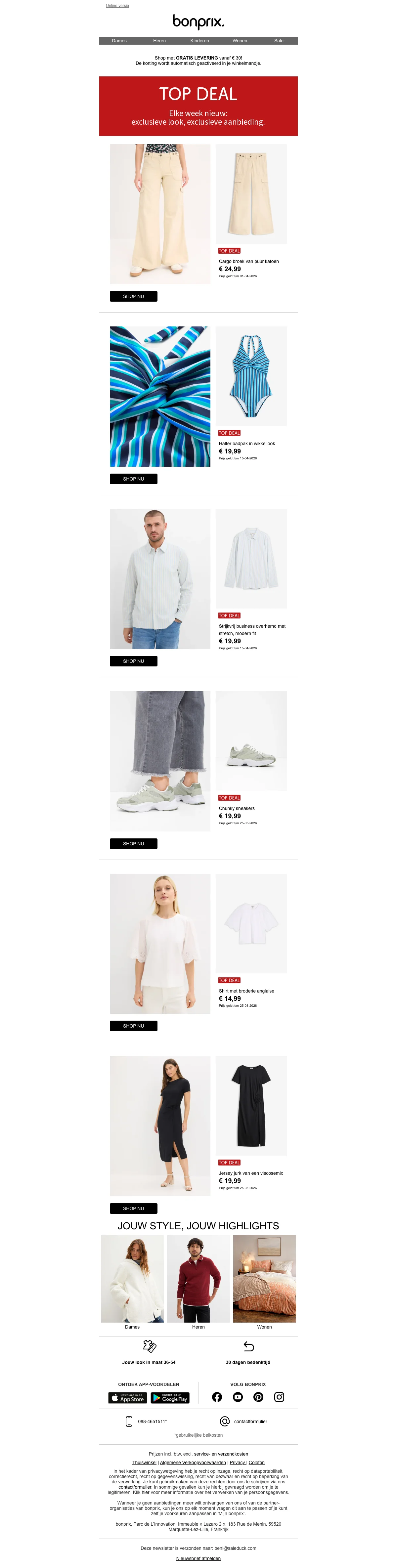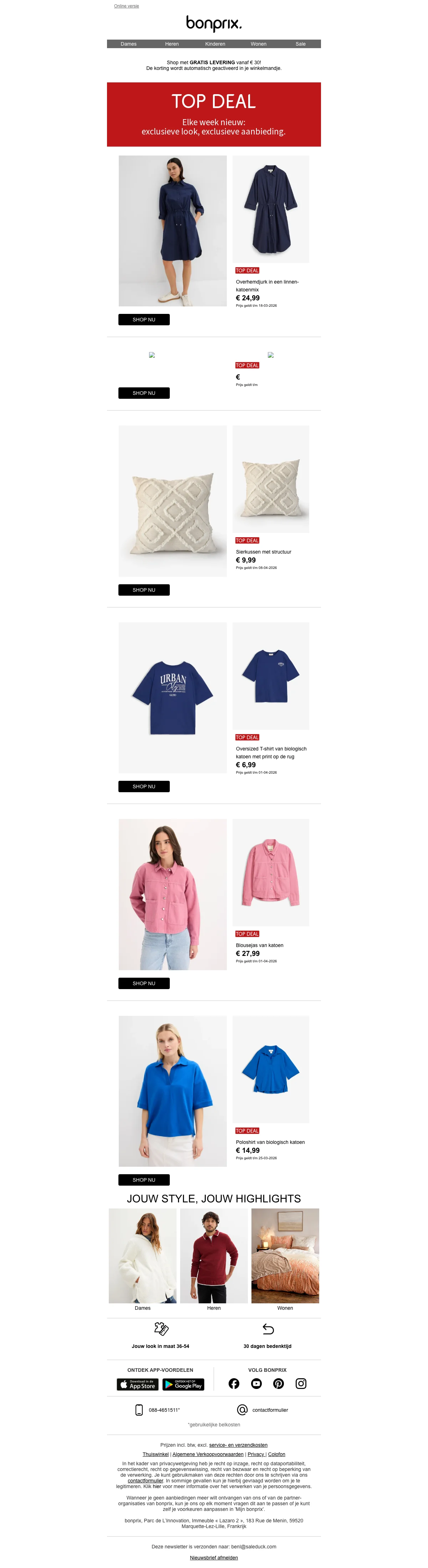Het is een webwinkel die haar bezoekers van de mogelijkheid voorziet om een keuze te maken uit een uitgebreid aanbod aan verschillende kleren. Of je nu op zoek bent naar een stijlvolle jurk om mee naar een bal te gaan of je gewoon mooie lingerie wenst aan te kopen, je bent bij Bon Prix ongetwijfeld aan het juiste adres. Zoals de naam van de webwinkel reeds enigszins verraadt kun je bij Bon Prix ook altijd rekenen op een interessante en vooral lage prijs.
