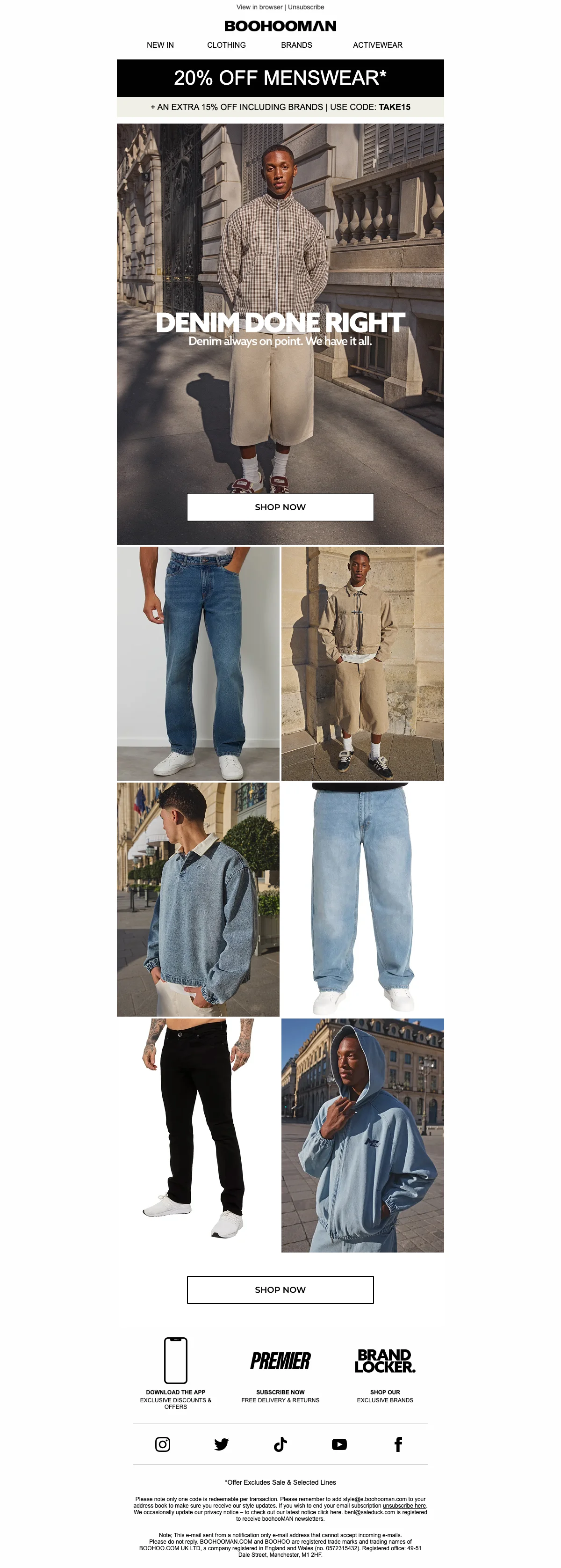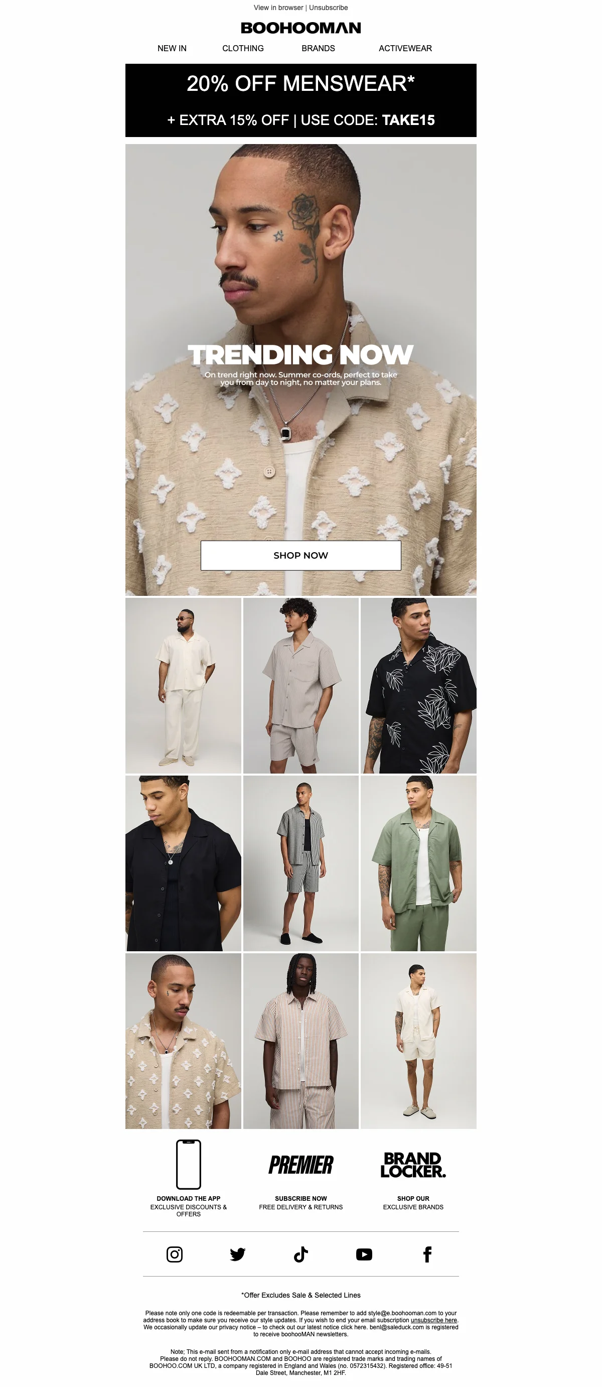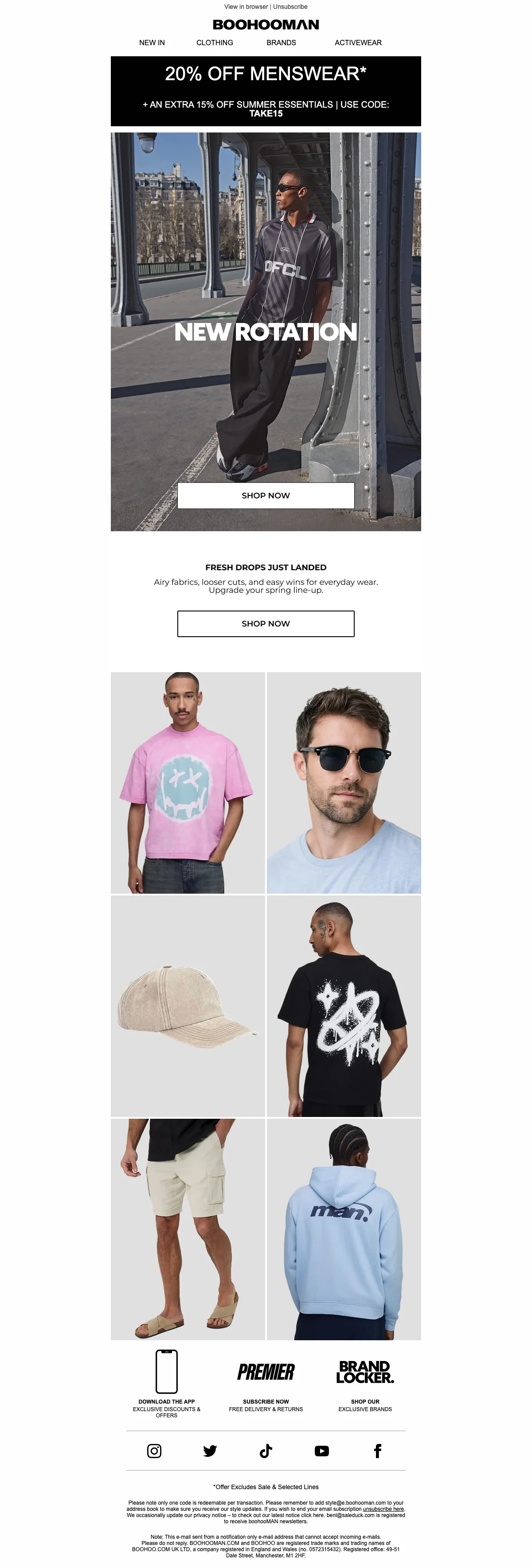 BoohooMAN lenteaanbieding: extra 10% app-korting bovenop 20% herenkleding