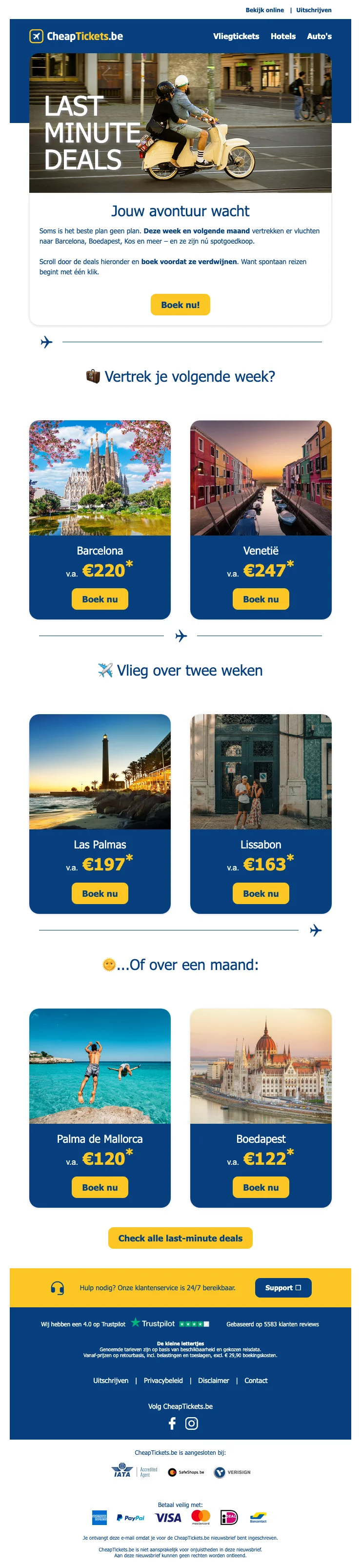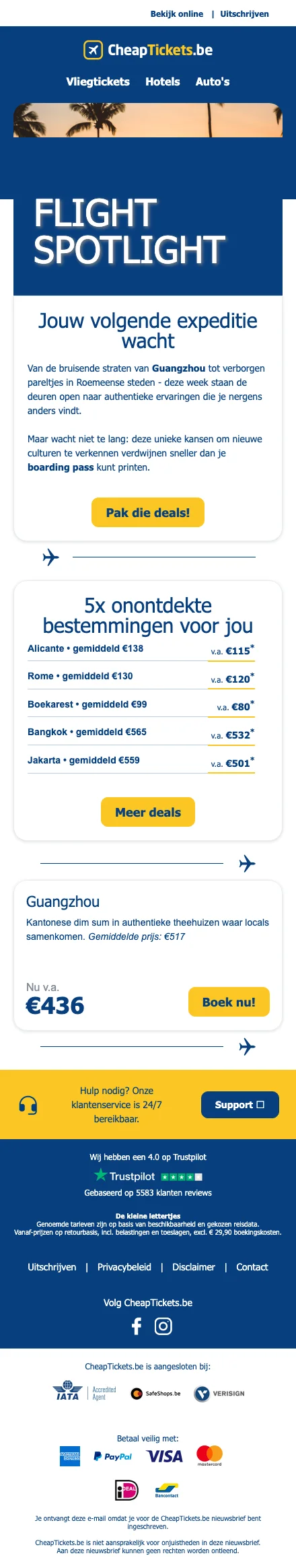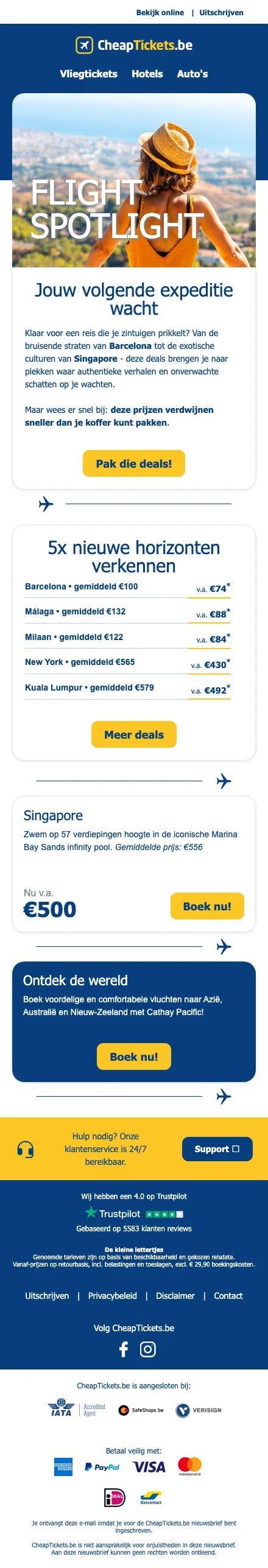 Daarnaast zetten ze altijd de beste promoties van dit moment op de homepage. Denk bijvoorbeeld aan vroegboek deals, zowel voor Europa als voor de rest van de wereld. Ook last minutes en rustige tripjes tijdens het najaar horen hier bij. Als een bepaalde luchtvaartmaatschappij een sale heeft, zetten ze dit meestal ook op de homepage. Solden mogelijk genoeg!