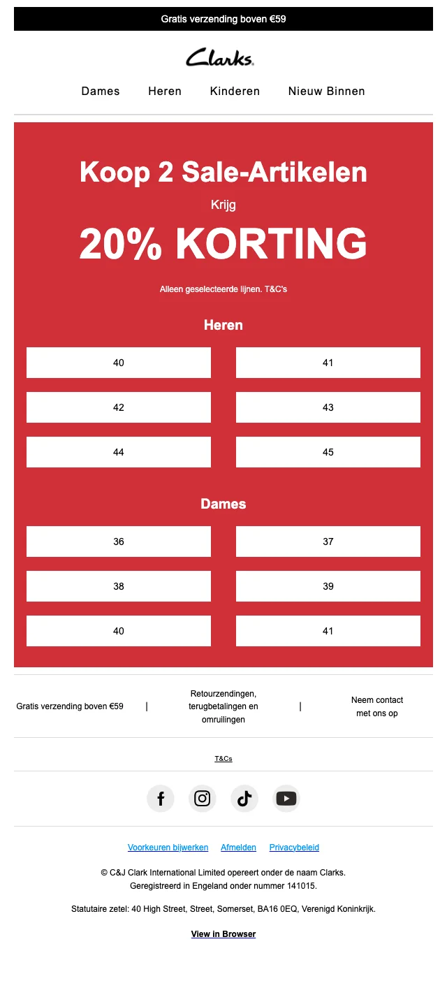 Je kunt als klant gebruikmaken van de Clarks kortingscode waardoor je schoenen nu nog iets goedkoper worden. Is deze niet online? Ga dan naar de Sale sectie op de website. Hier kan je natuurlijk altijd terecht voor de beste koopjes van het moment. Een makkelijke manier om als nieuwe klant voordeel te krijgen, is door je in te schrijven voor de nieuwsbrief. Je krijgt dan meteen € 10 korting op je eerste online bestelling.