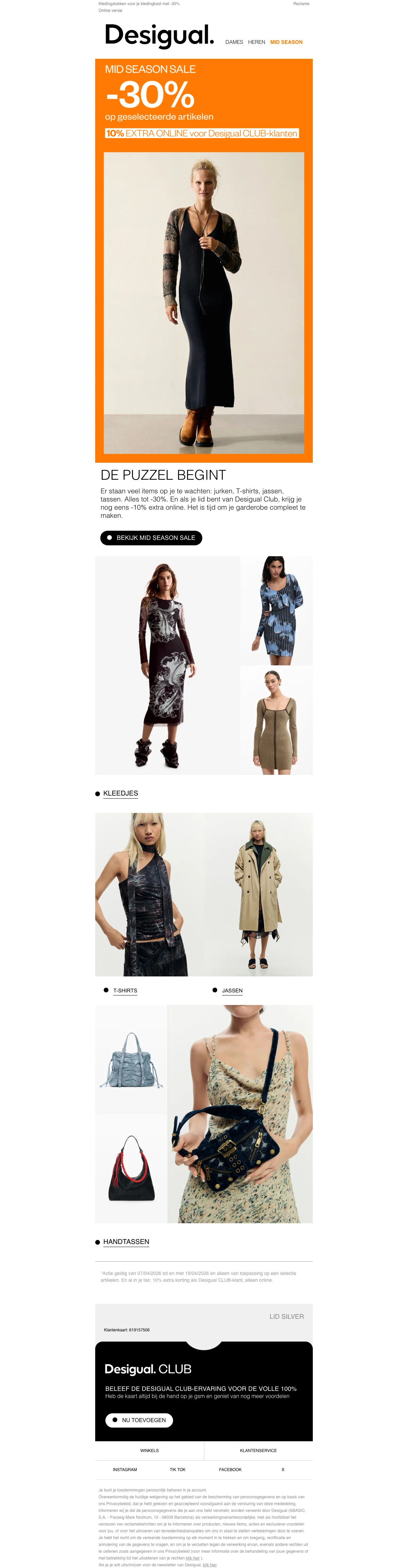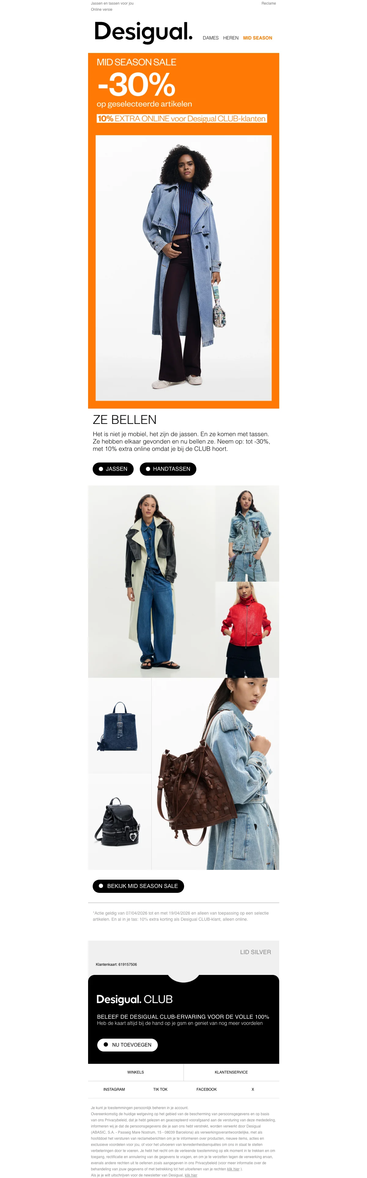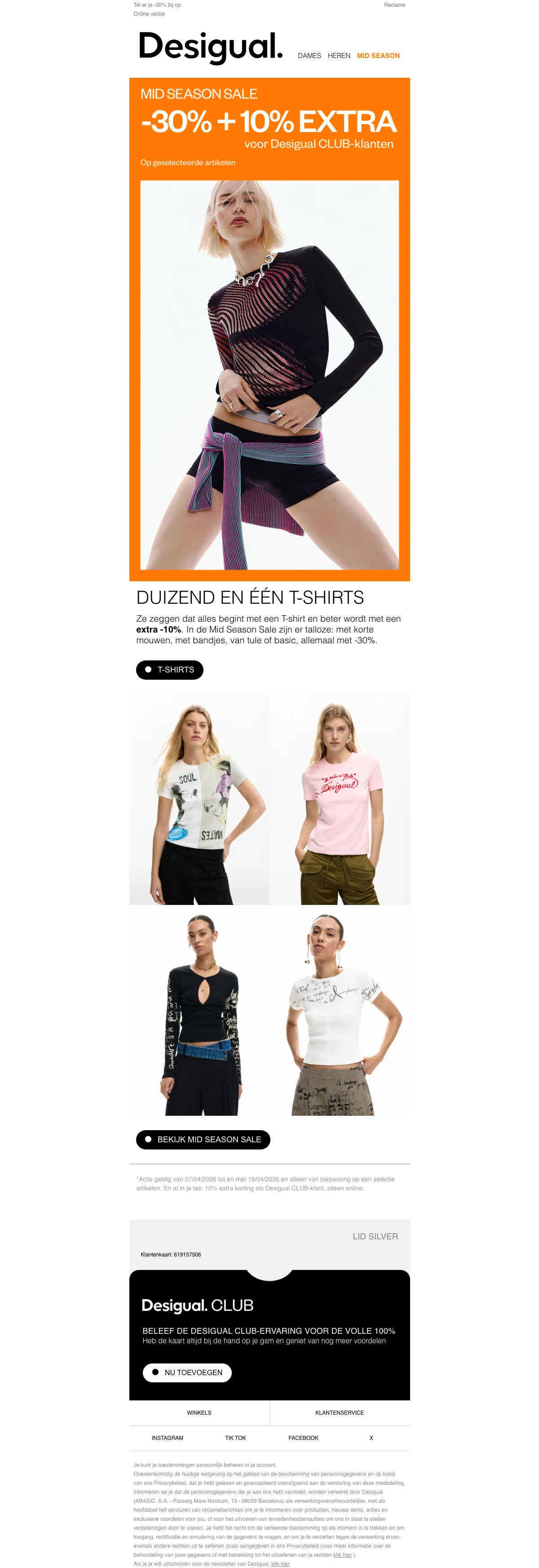 Ontvang -30% op geselecteerde artikelen tijdens de Mid Season Sale en profiteer als Desigual CLUB-lid van een extra 10% korting bij online aankopen. Vul je tas alvast; kortingen worden automatisch toegepast op geselecteerde producten.