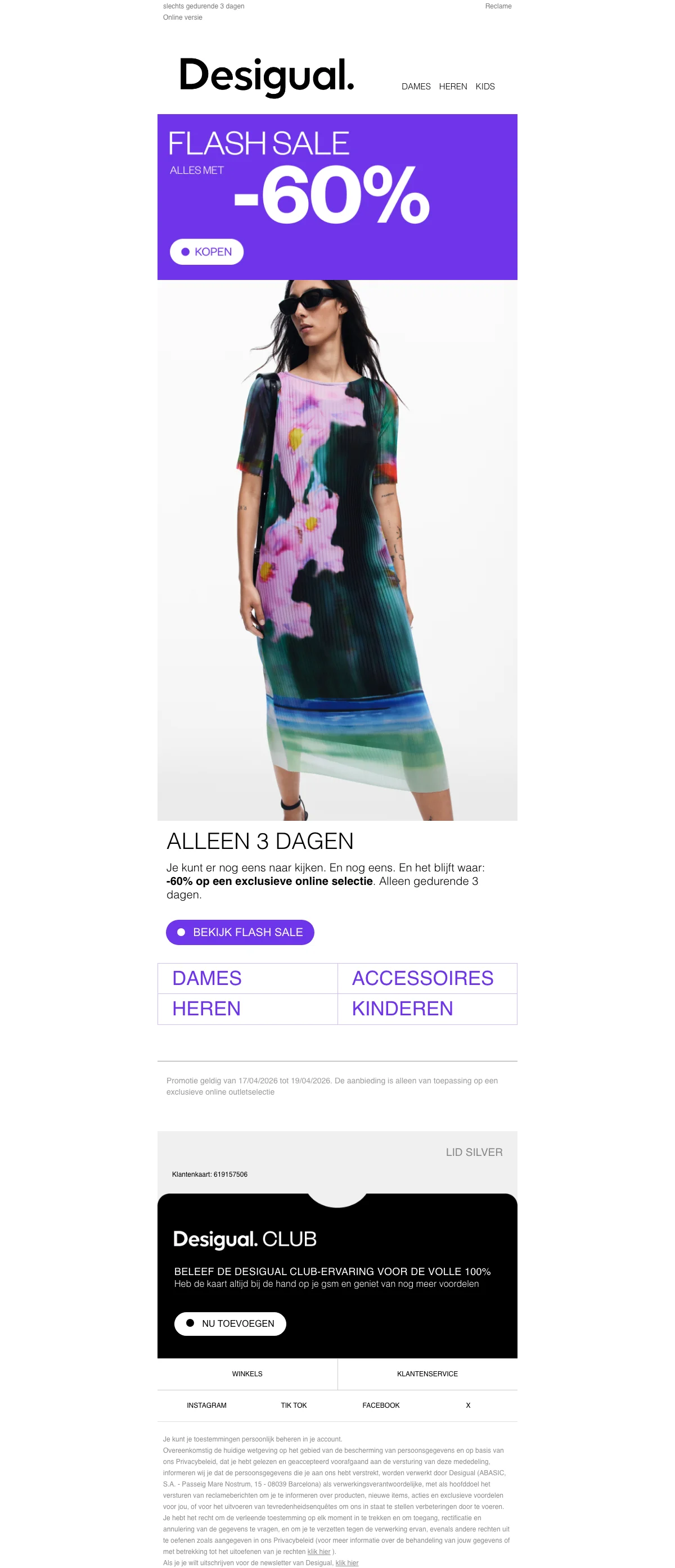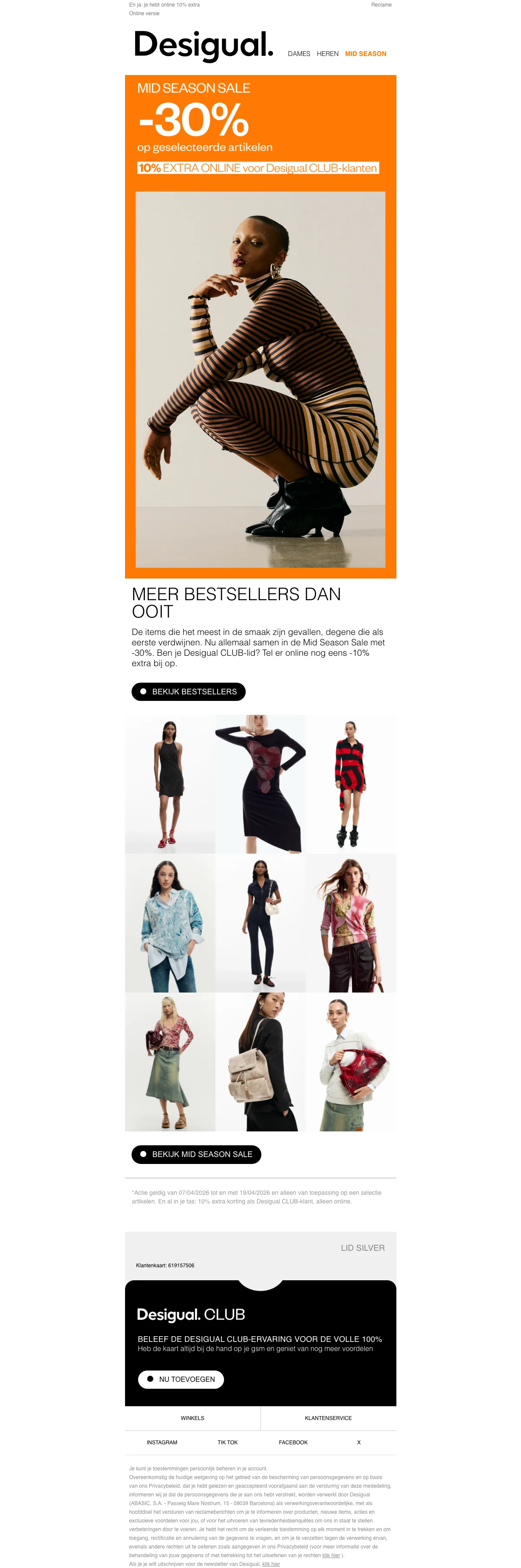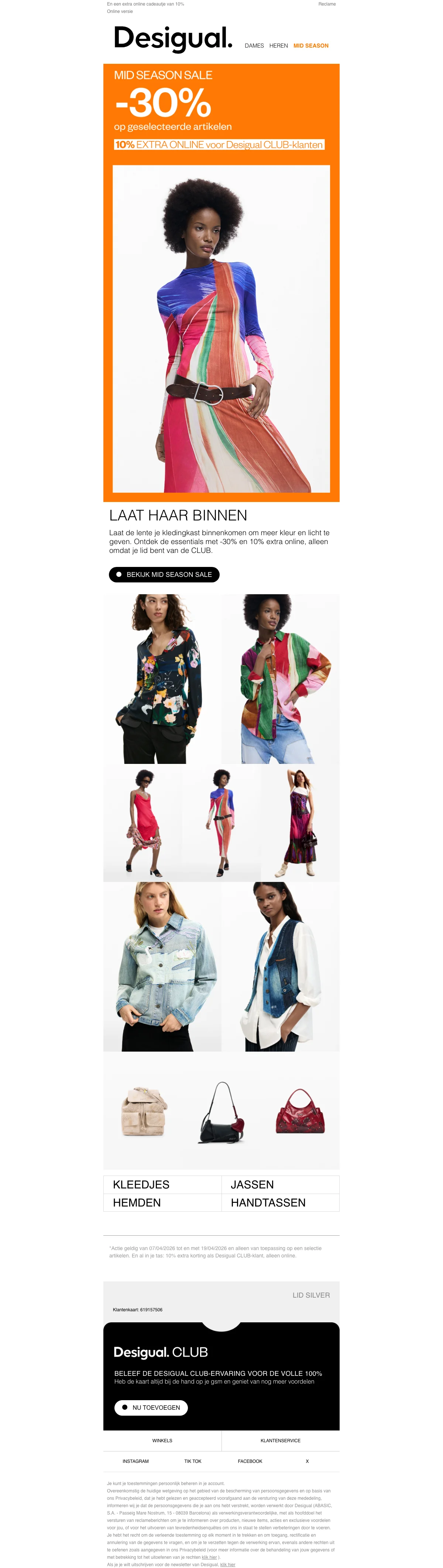 Ontvang -30% op geselecteerde artikelen tijdens de Mid Season Sale en profiteer als Desigual CLUB-lid van een extra 10% korting bij online aankopen. Vul je tas alvast; kortingen worden automatisch toegepast op geselecteerde producten.