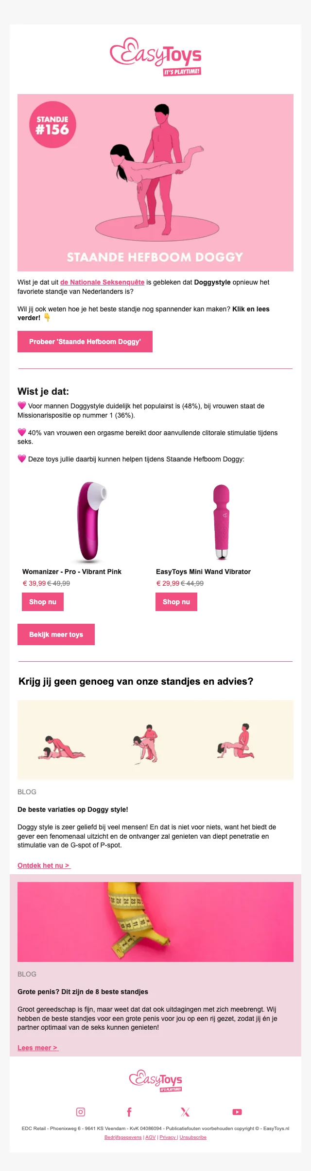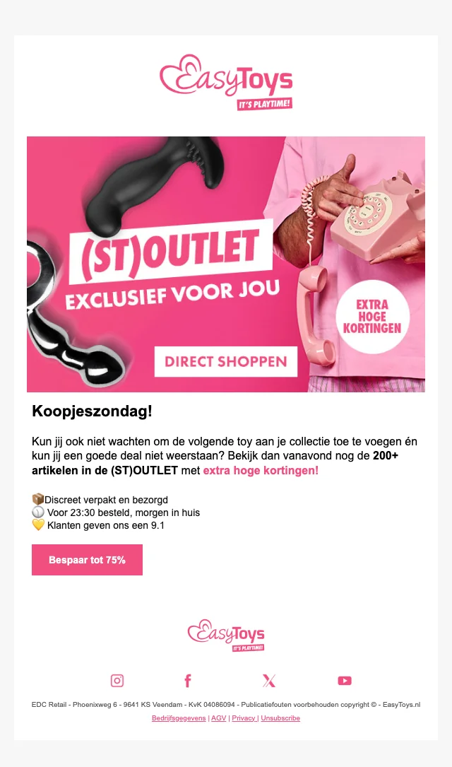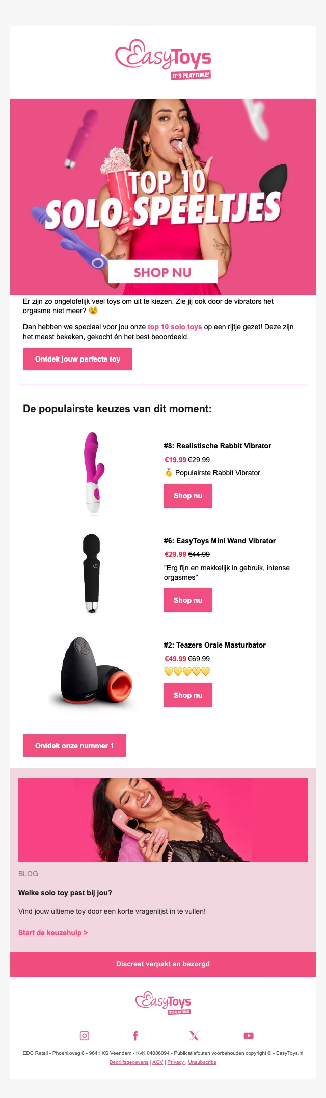 Bij EasyToys vind je de spannendste speeltjes voor volwassenen. In de sale geniet je deze maand van hoge kortingen die oplopen tot wel 35%. Verwen jezelf of een ander met een nieuwe vibrator, dildo, buttplug of kunstvagina. Voor degenen die zich graag helemaal overgeven of een ander willen domineren zijn er verleidelijke bondage producten en sexy zweepjes. Kortom: wacht niet te lang en neem gauw even een kijkje bij de webwinkel.