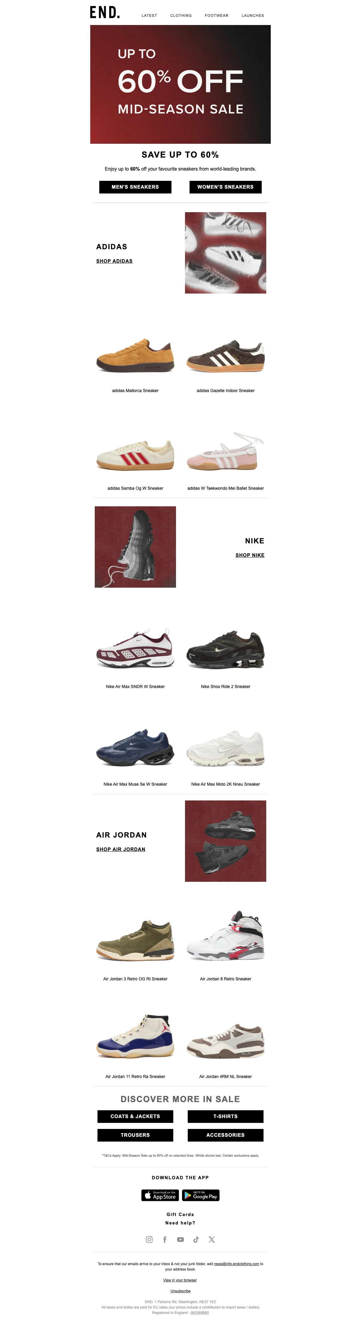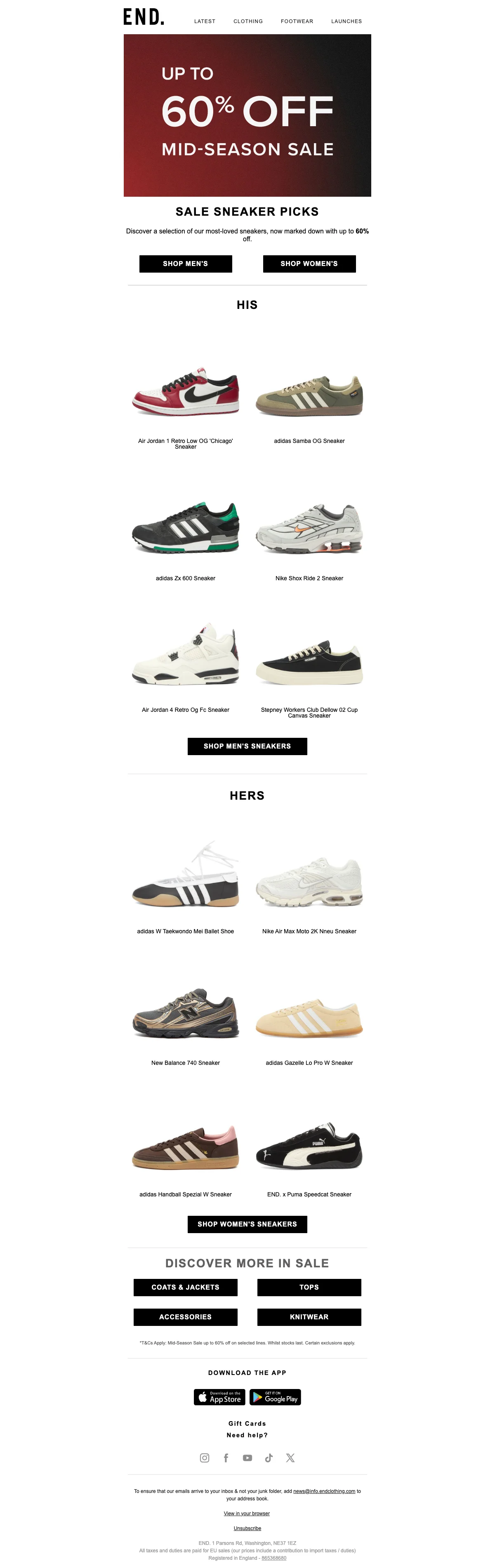 Profiteer van kortingen tot 60% op geselecteerde heren- en dameskleding, sneakers en accessoires tijdens de mid-season sale. Voorraad is beperkt en soms gelden uitsluitingen op bepaalde artikelen. Perfect moment om favoriete items scherp geprijsd te scoren.