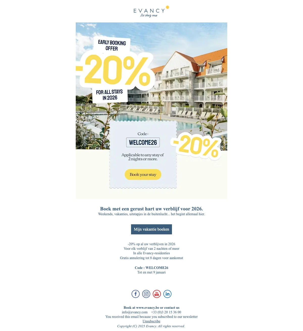 De Evancy kortingscode is WELCOME26. Vul onze code voor Evancy 2026 in op de afrekenpagina en ontvang exclusieve kortingen. Vroegboekkorting voor verblijven in 2026.