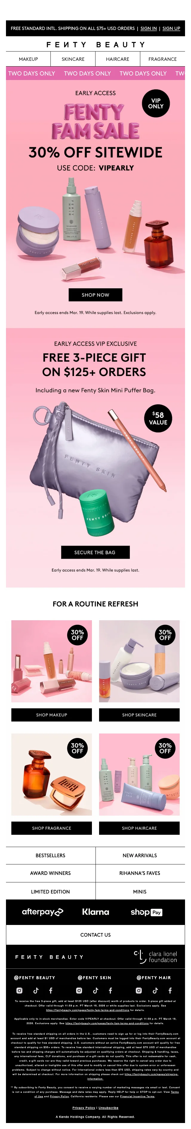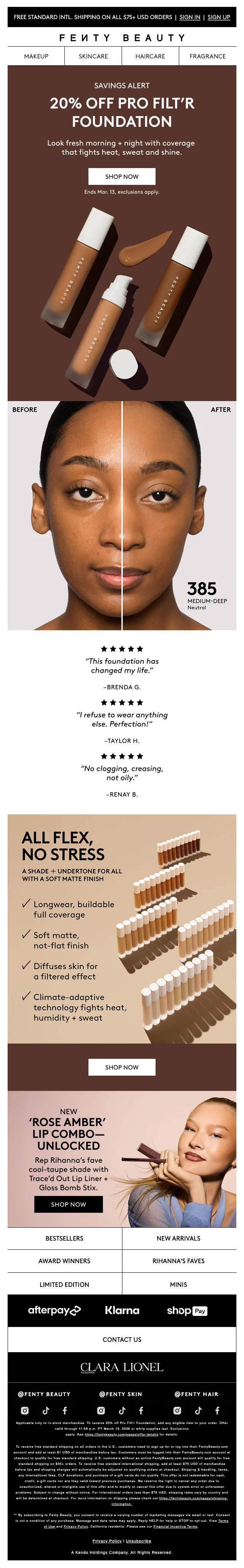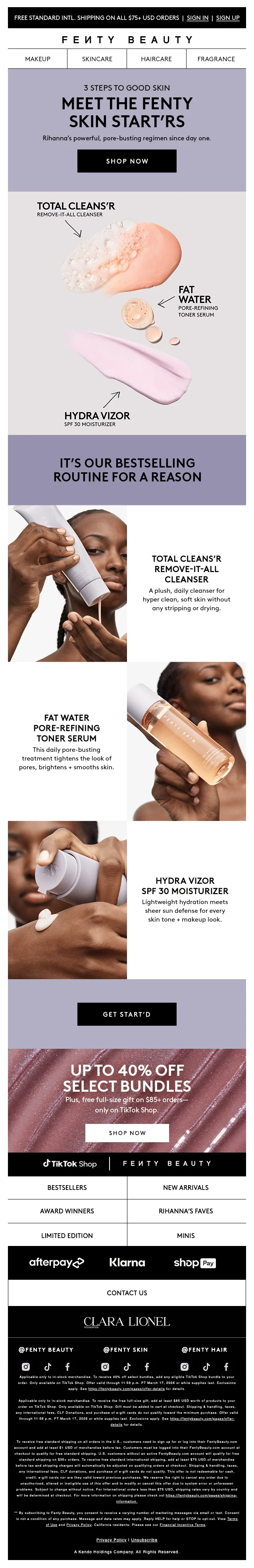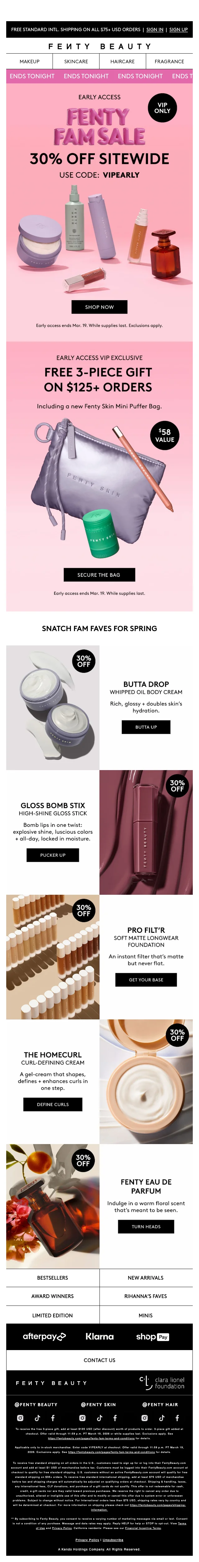 Profiteer van een fantastische 30% korting op het gehele assortiment van Fenty Beauty. Of je nu op zoek bent naar make-up, huidverzorging, haarproducten of geuren, je vindt het allemaal hier. Geniet van deze geweldige aanbieding en verwen jezelf met de beste producten.