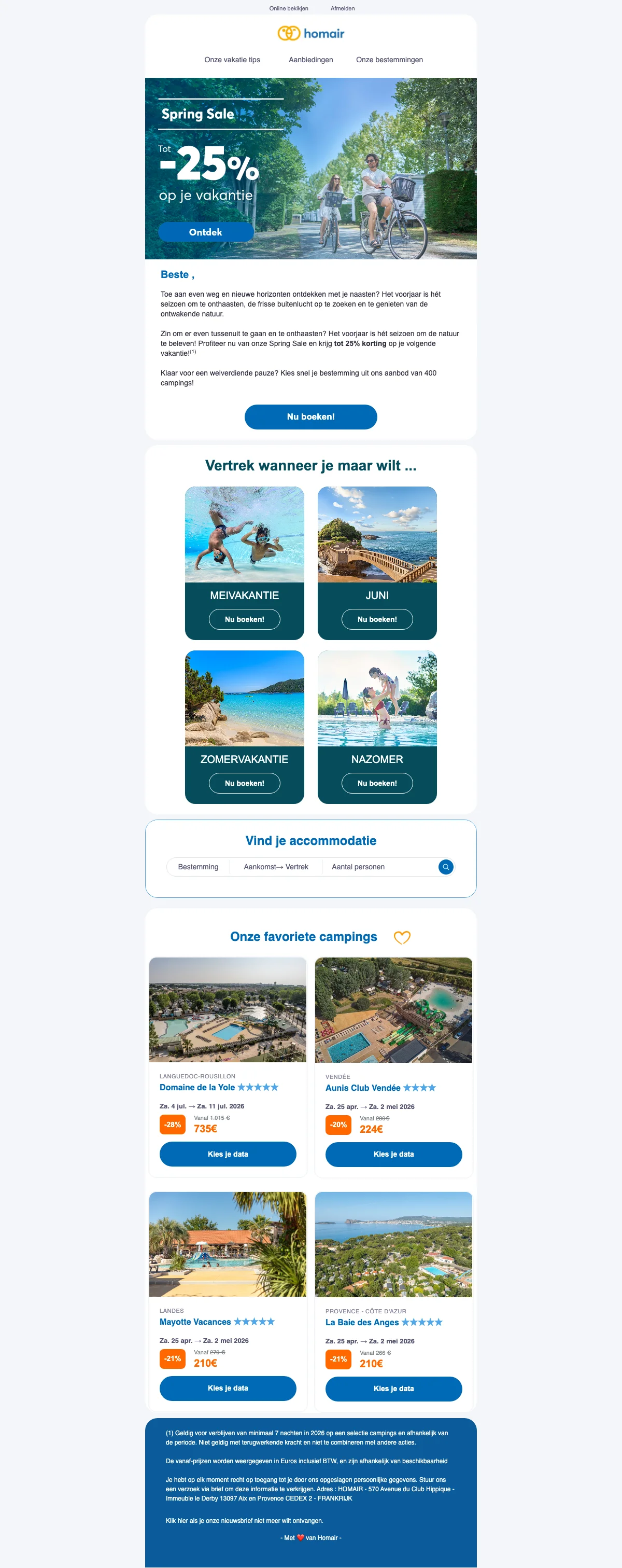 Wil je volgend jaar graag op vakantie, maar heb je nog geen idee waarheen? Laat je dan inspireren door de exclusieve vroegboekaanbiedingen van Homair, waarmee je extra korting krijgt op je verblijf in bijvoorbeeld Torreilles, Rome of Bonifacio. Dat bespaart weer flink veel geld!