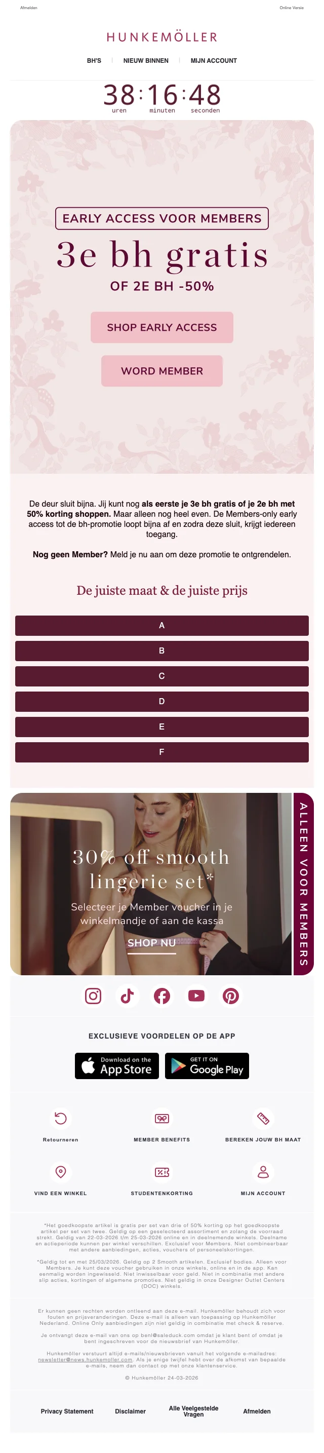 Shop 2 bh's en krijg de 3e gratis, of kies 2 en ontvang 50% korting op het goedkoopste artikel. Geldig op geselecteerd assortiment en zolang de voorraad strekt; exclusief bodies en Designer Outlet Centers. Alleen voor Members en niet combineerbaar met andere acties.