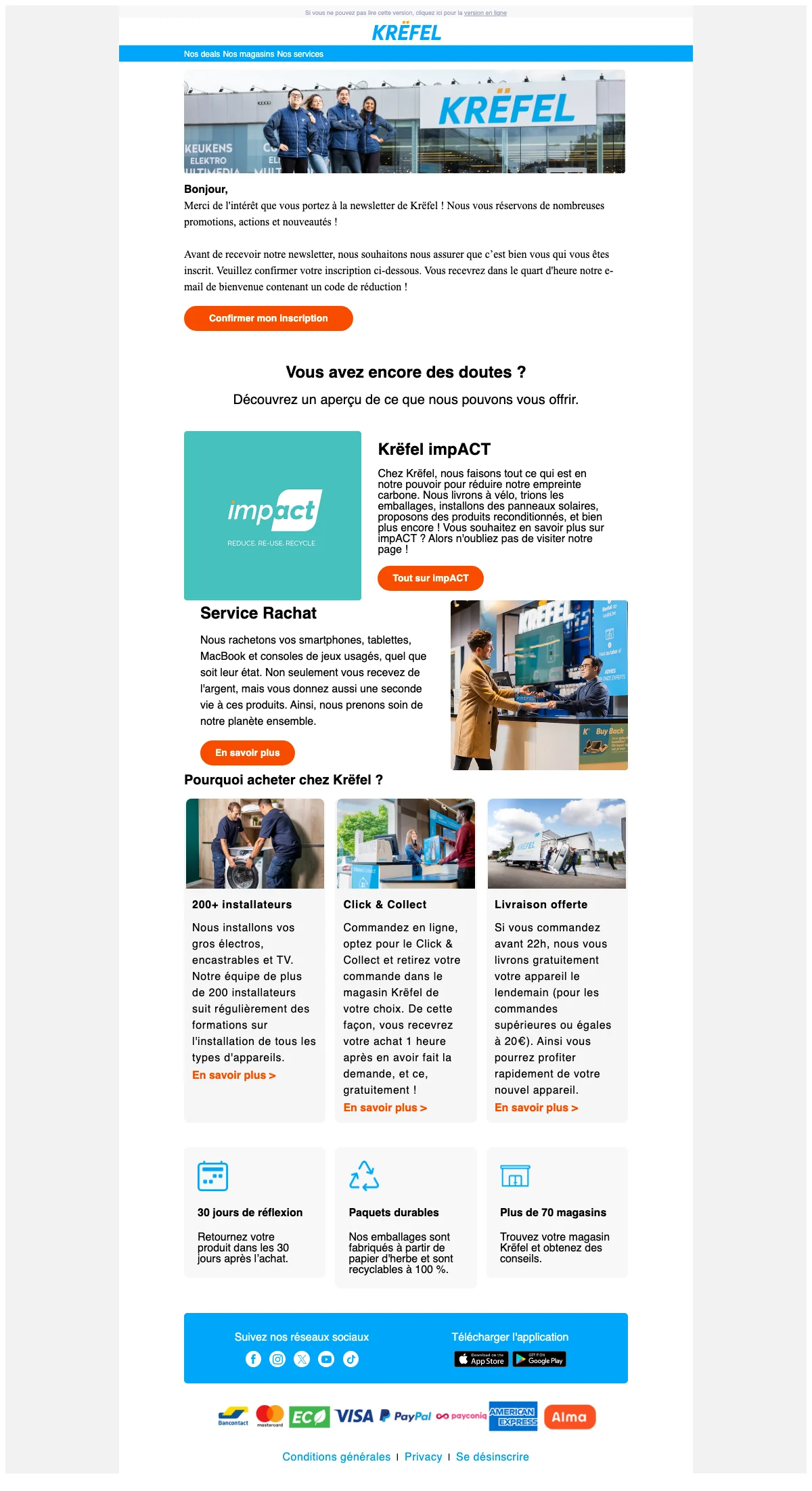 Krëfel is gespecialiseerd in de verkoop van groot elektro, klein elektro, inbouwtoestellen, tv & audio, multimedia, telefonie, koken & tafelen en accessoires. Ontdek het ruime assortiment van de webshop en geniet van de scherpste prijzen om elektronicaproducten. De keten werd in 1958 opgericht met het streven om superieure kwaliteit en duurzaamheid te leveren. Jaren later is het bedrijf gegroeid en werden de productassortimenten en de productkeuze uitgebreid en heeft het nu zelfs een megastore. Naast de vele winkels is een webwinkel natuurlijk ook reuzehandig voor al je elektronica behoeften. Wacht daarom niet langer en neem een kijkje in de webshop. Je zal gegarandeerd vinden wat je zoekt. Er zijn verschillende ketens in België. Krëfel Hasselt en Krëfel Oostende zijn een van de grotere.
