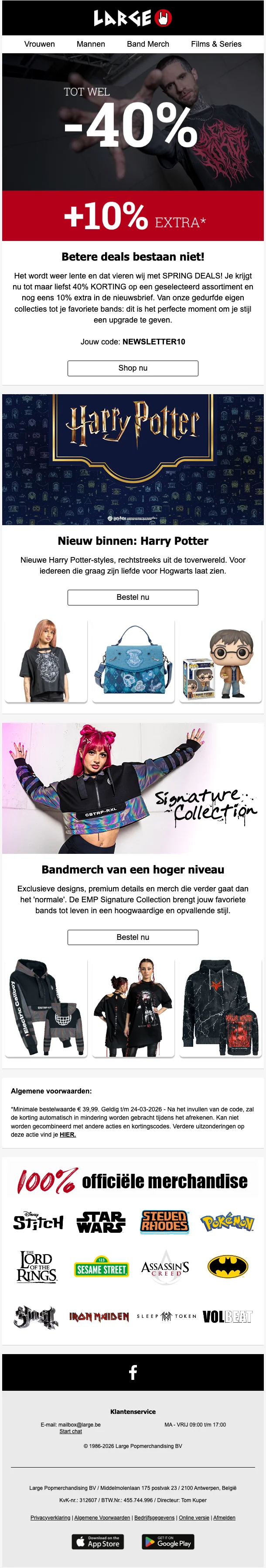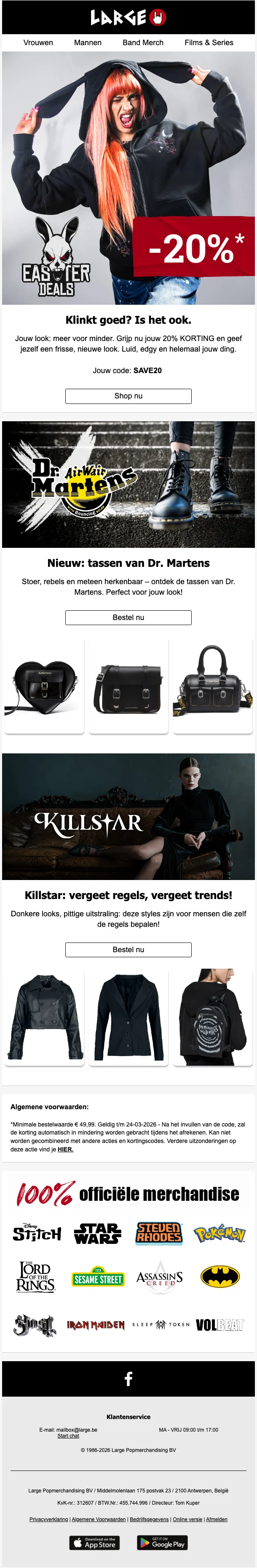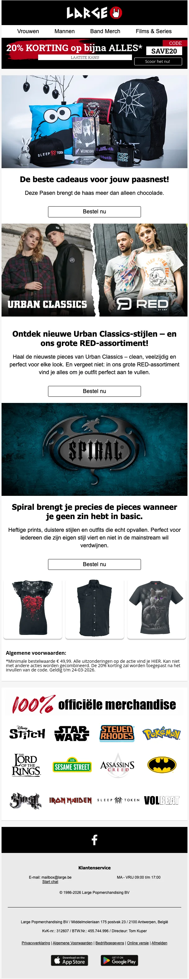 Bij Large be zijn er altijd en overal goede koopjes te vinden. Of je nu op zoek bent naar kledij voor mannen of vrouwen, band merch, gaming merch of cd's, je kan hier je voordeel doen. Wij van Solden.be hebben bovendien regelmatig een handige kortingscode die je recht geeft op 5 of meer euro korting, bij het uitgeven van een minimaal bestedingsbedrag.