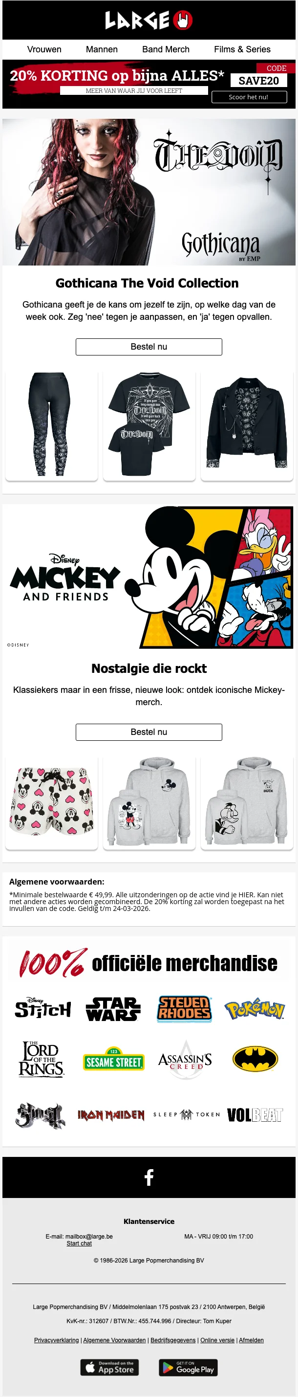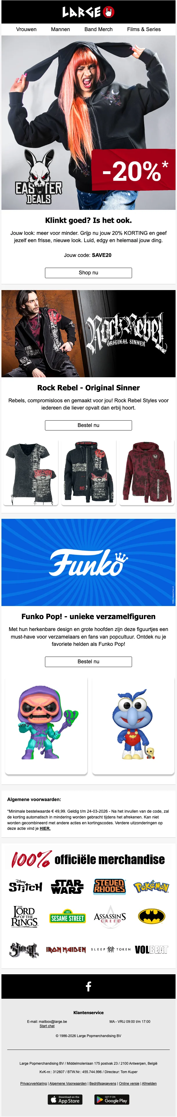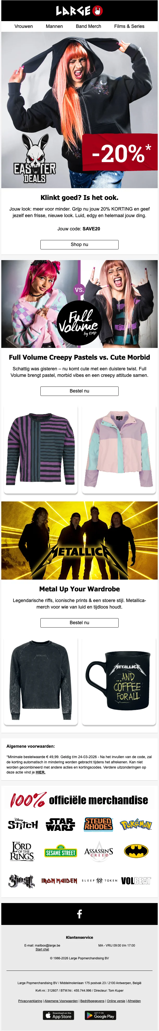 Large merchandising is een van de grootste gespecialiseerde kledingwebshops van de Benelux. Ze maken onderdeel uit van EMP, een winkel die al meer dan 30 jaar lang kleding en andere artikelen aan de man brengt. Hun doelpubliek is specifiek en toch alomvattend: metalheads, hard rock liefhebbers, gamers, punkers, emo, street wear, goths, hipsters, al deze subculturen komen hier aan hun trekken. De webshop biedt unieke kledij. merchandise en accessoires aan voor een erg aantrekkelijke prijs. Om die reden is Large.be al lange tijd een begrip voor shoppers, ook voor zij met grote maten. Vele Vlamingen krijgen ieder seizoen de Large catalogus in huis. Je kan deze online bestellen en ook doorbladeren. Handig om te weten wat je allemaal kan kopen.