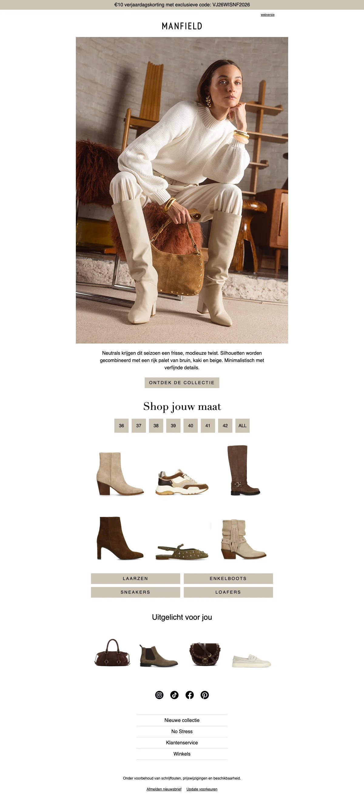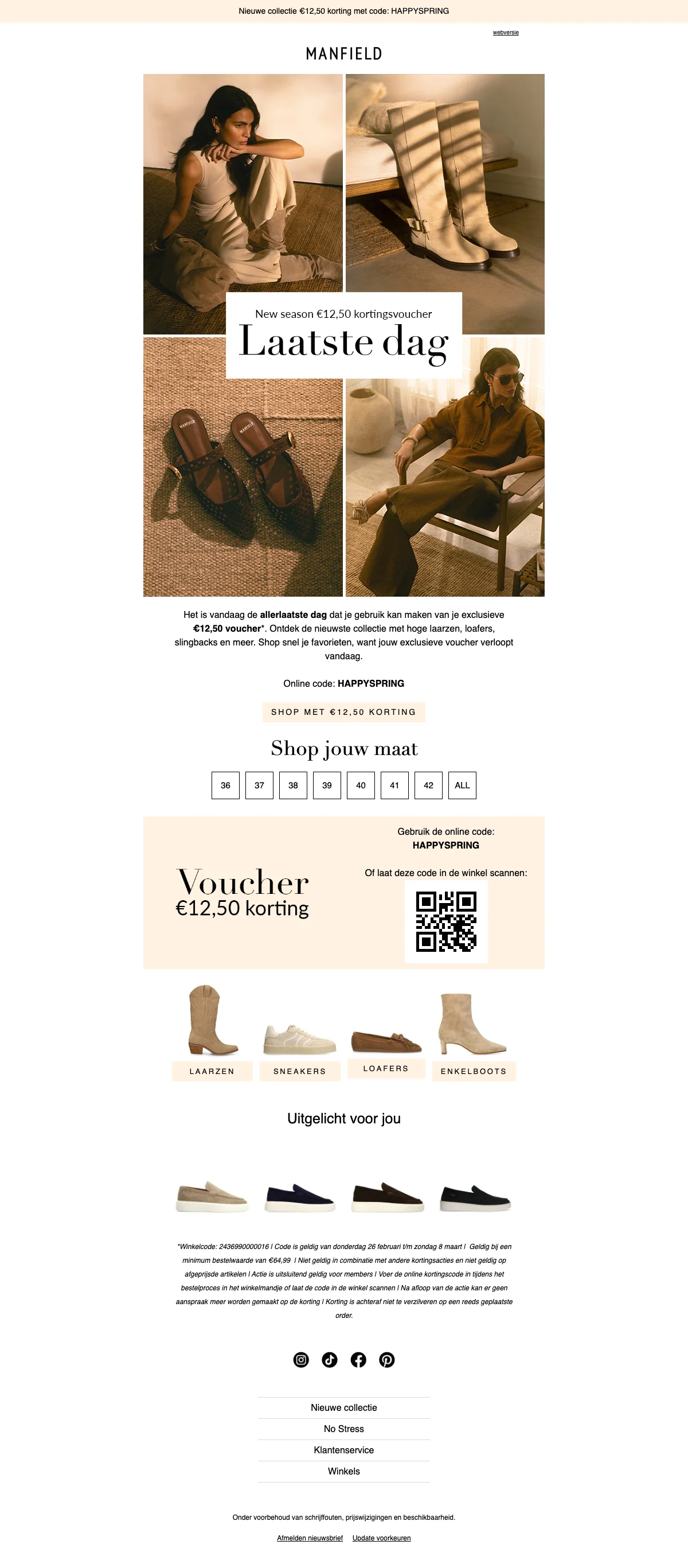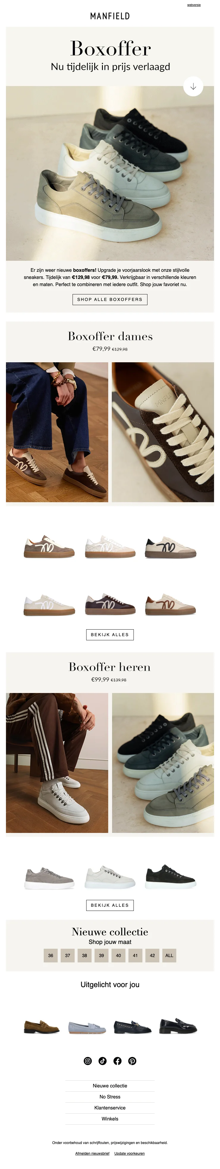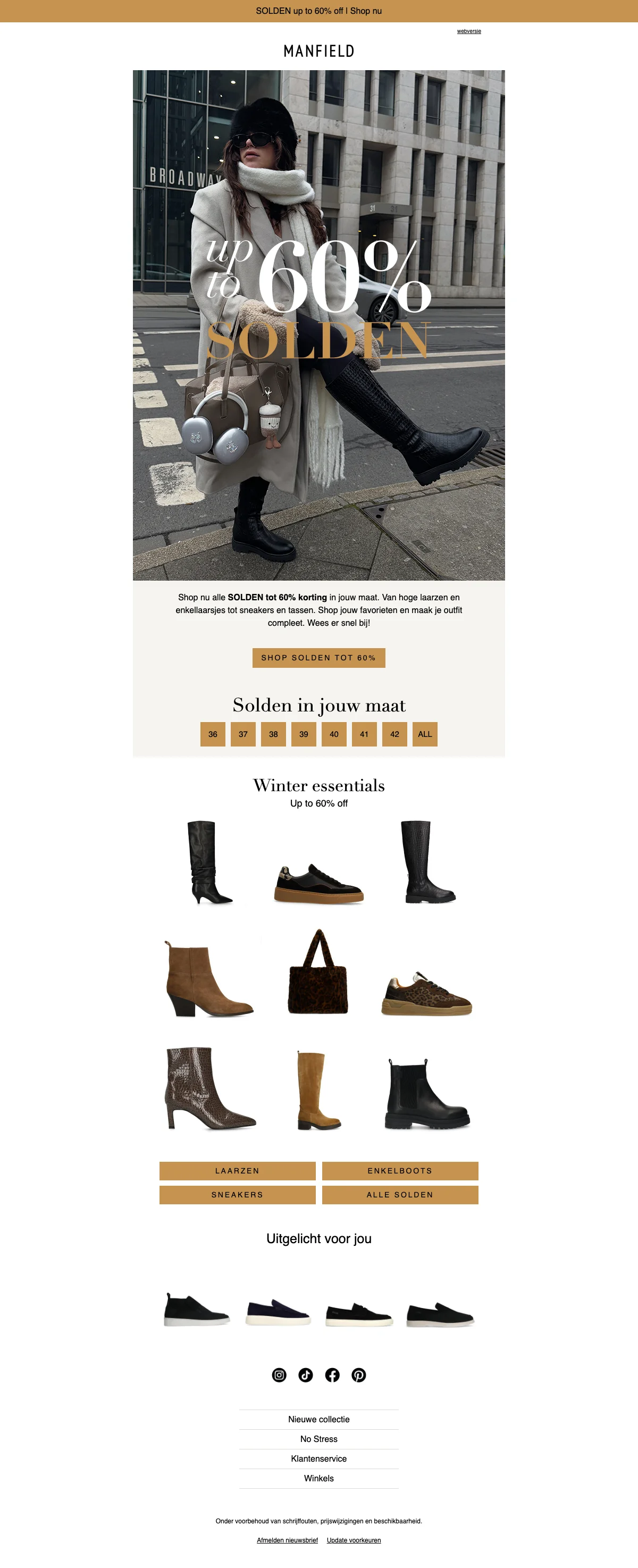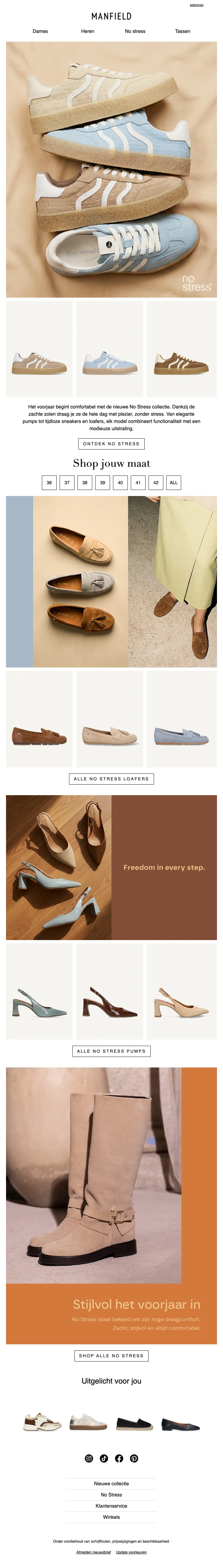 Manfield is een van oorsprong Engels kleding merk dat al in 1900 zijn deuren opende in een prachtige Amsterdamse winkelstraat. De schoenen die Manfield biedt staan voor kwaliteit en klasse. Daarna werden er al gauw nieuwe filialen geopend. Vandaag de dag is het merk uitgegroeid tot een keten van meer dan 45 winkels in zowel Nederland als Duitsland. Maar natuurlijk is het ook mogelijk om kleding te bestellen als je in België woont. Het merk is inmiddels al veel meer dan enkel schoenen, want ze bieden bijvoorbeeld ook riemen, pantoffels en portemonnees aan. Een kwalitatief hoog merk dat stijlvolle items aanbiedt waar iedereen wel iets van in huis wil hebben. Solden biedt met regelmaat kortingsacties aan dus zorg dat je de website in de gaten houdt om geen kortingen mis te lopen.