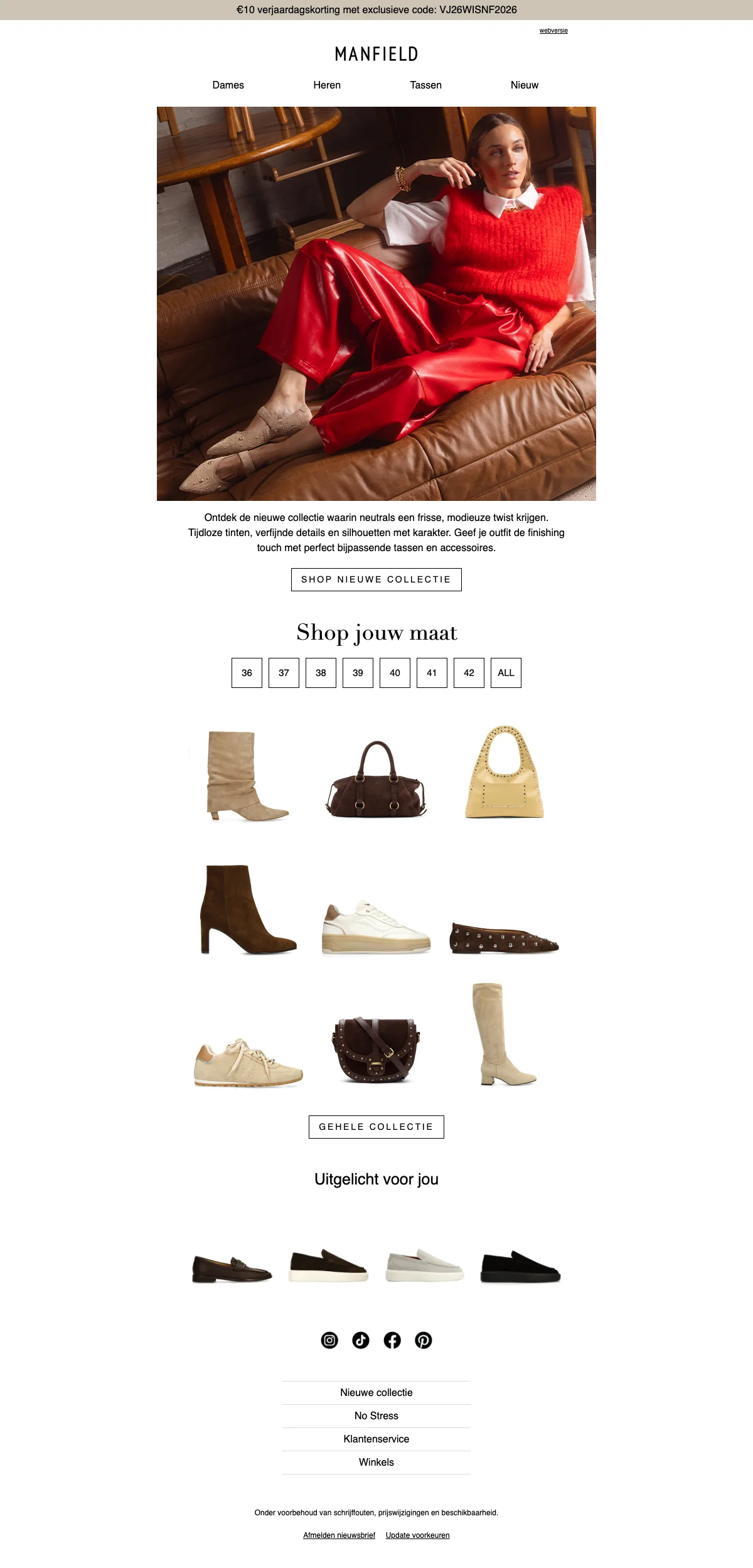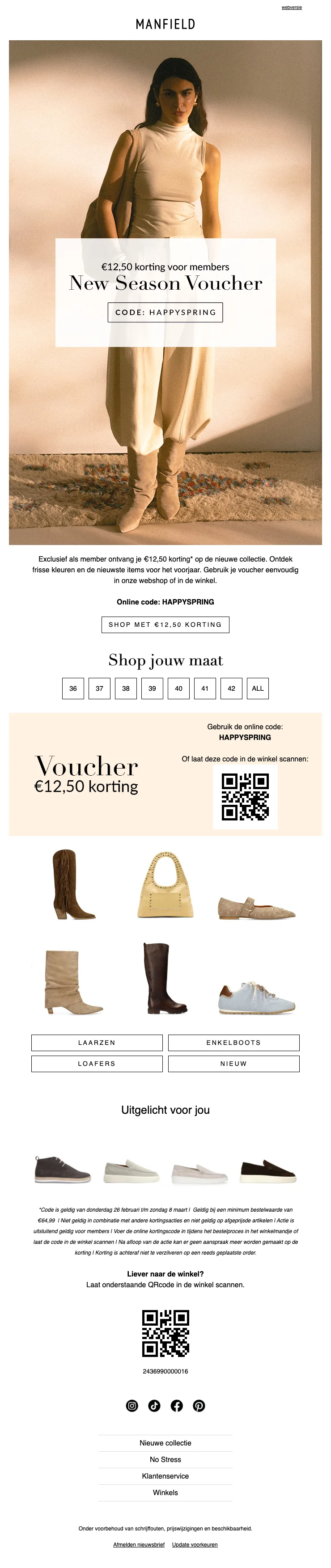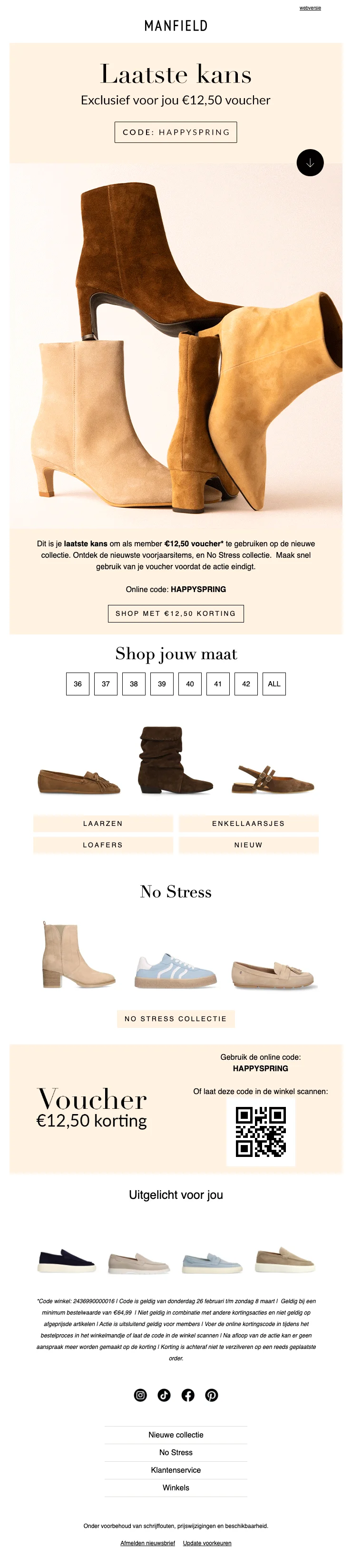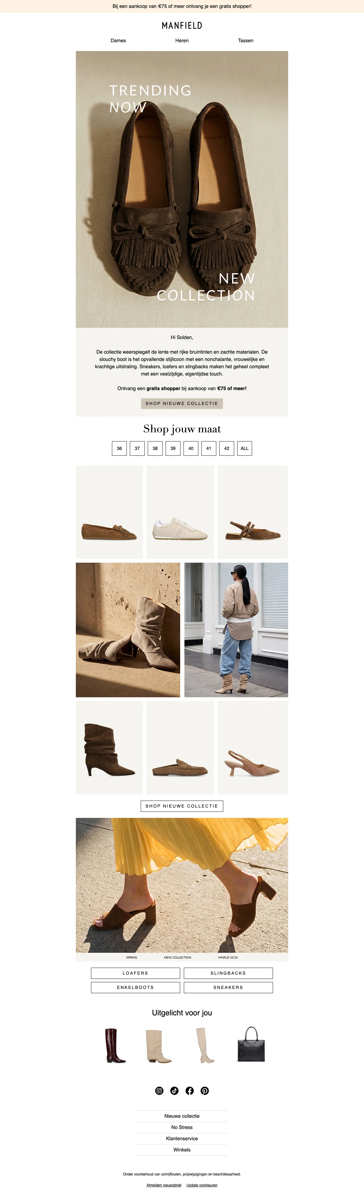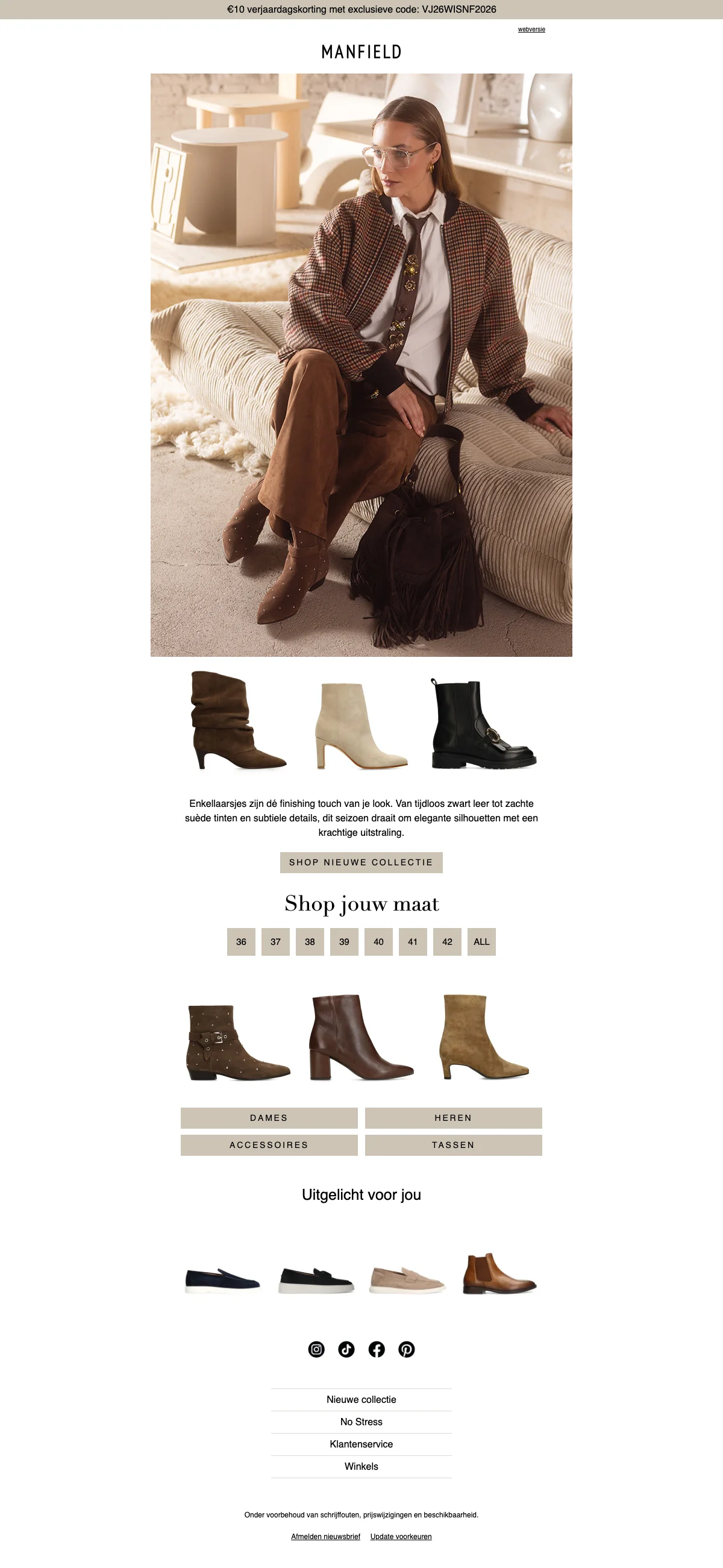 Manfield is een van oorsprong Engels kleding merk dat al in 1900 zijn deuren opende in een prachtige Amsterdamse winkelstraat. De schoenen die Manfield biedt staan voor kwaliteit en klasse. Daarna werden er al gauw nieuwe filialen geopend. Vandaag de dag is het merk uitgegroeid tot een keten van meer dan 45 winkels in zowel Nederland als Duitsland. Maar natuurlijk is het ook mogelijk om kleding te bestellen als je in België woont. Het merk is inmiddels al veel meer dan enkel schoenen, want ze bieden bijvoorbeeld ook riemen, pantoffels en portemonnees aan. Een kwalitatief hoog merk dat stijlvolle items aanbiedt waar iedereen wel iets van in huis wil hebben. Solden biedt met regelmaat kortingsacties aan dus zorg dat je de website in de gaten houdt om geen kortingen mis te lopen.