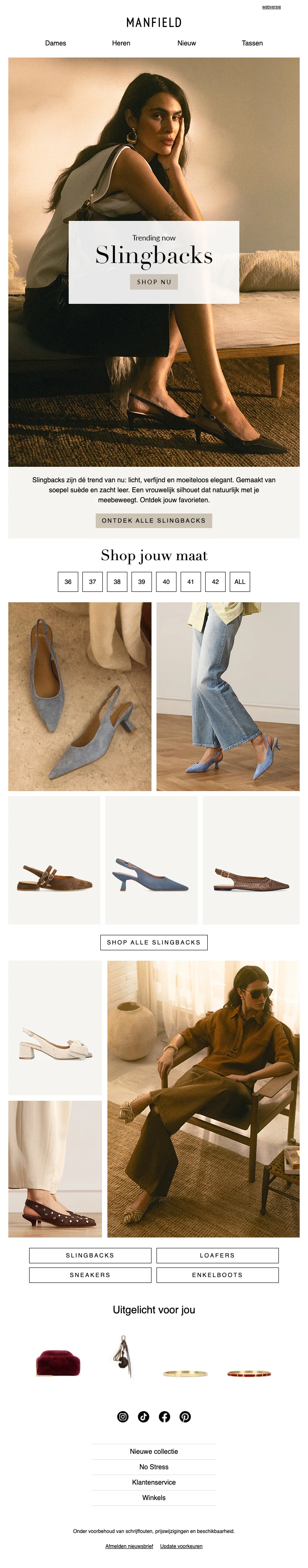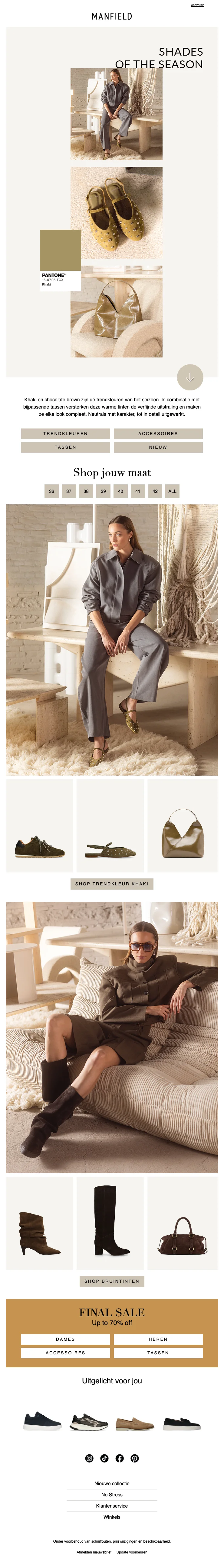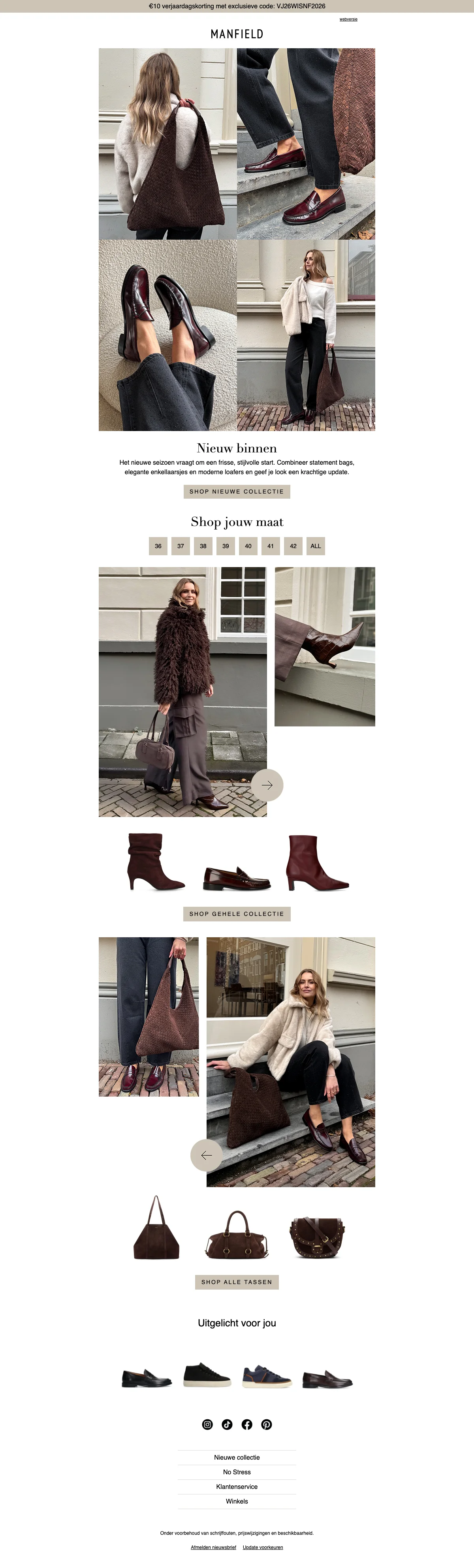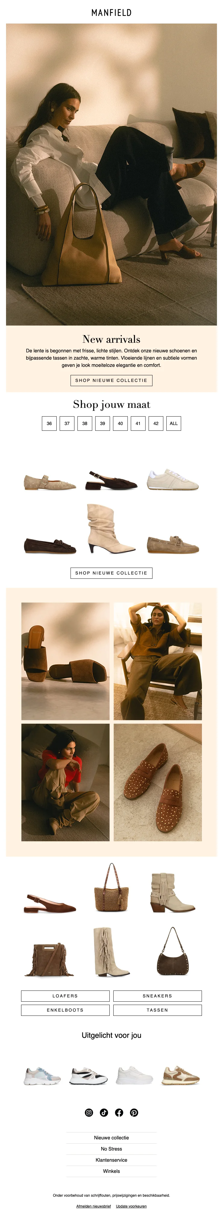 Manfield staat voornamelijk voor het grote aantal schoenen natuurlijk. Het merk vertaalt zich naar de laatste modetrends en een zeer gevarieerd stijlaanbod. Het assortiment is uitgebreid met nieuwe details waarbij strakke belijningen en mooie leer kwaliteiten een belangrijke rol spelen. Naast basiskleuren als zwart en grijs zorgen de luxe, warme kleuren zoals diepzwart, dondergroen, navy en bordeaux voor een elegant en stijlvol karakter.