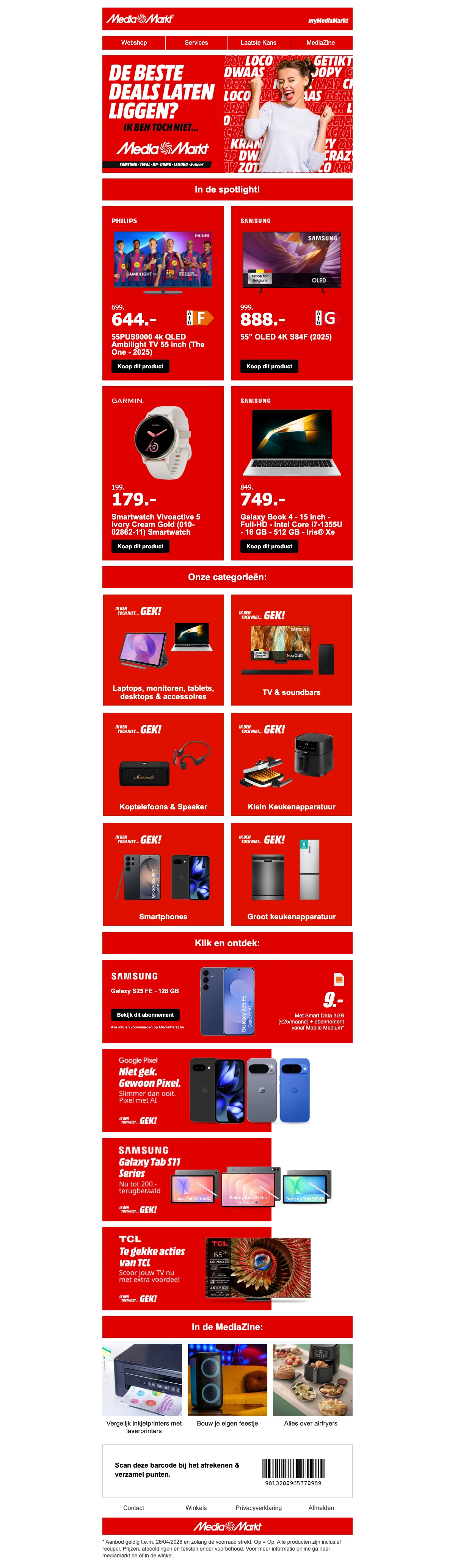 Pak je 55-inch 4K QLED Ambilight-tv voor €644 in plaats van €699; direct scherpe prijs op een topmodel. Geniet van helder beeld en Ambilight-sfeer; aanbod geldig t.e.m. 26/04/2026 en zolang de voorraad strekt.