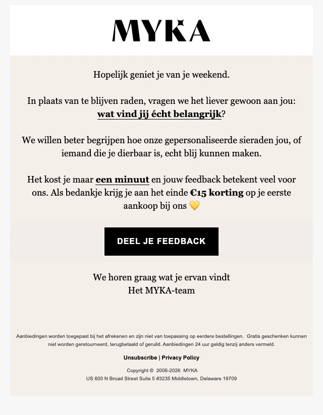 Myka enquête korting €15 korting op eerste aankoop sieraden