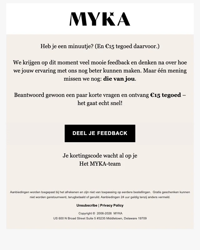 Vul een korte enquête en ontvang aan het einde €15 korting op je eerste aankoop bij MYKA. De korting wordt automatisch bij het afrekenen toegepast en geldt alleen voor nieuwe bestellingen.