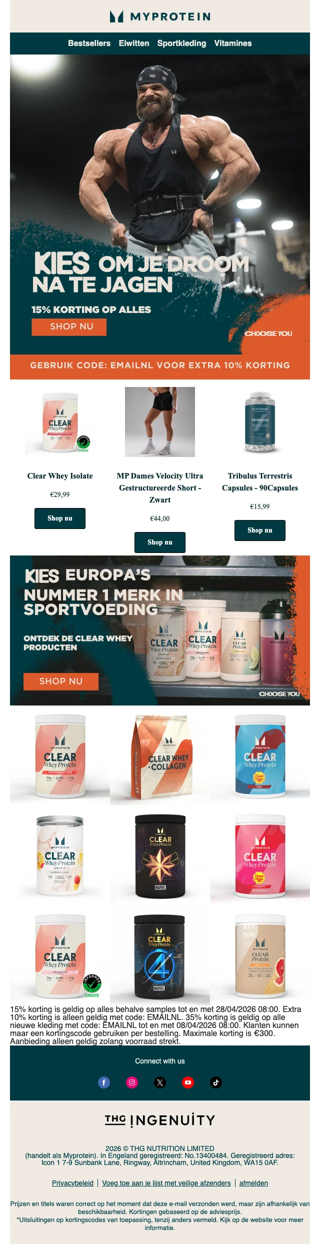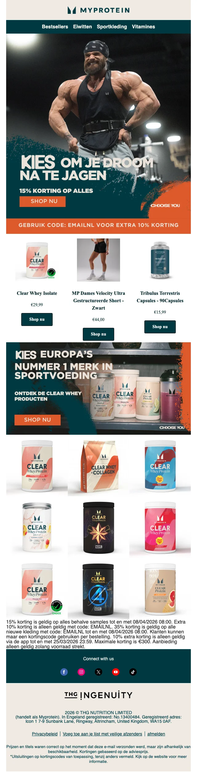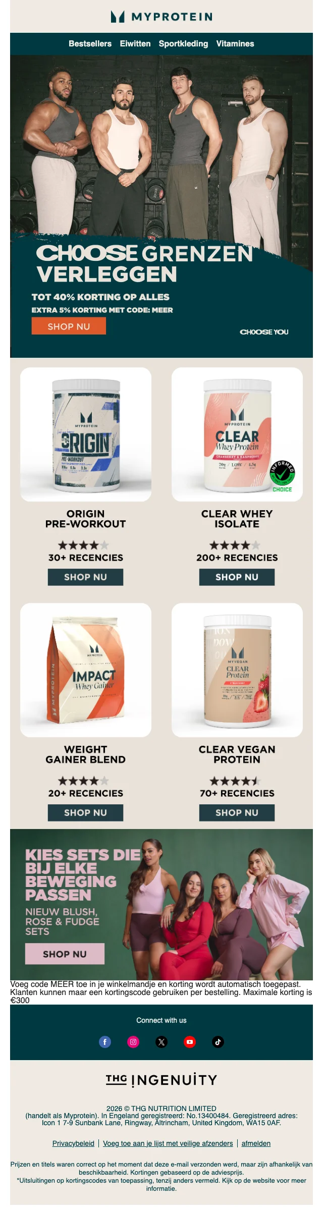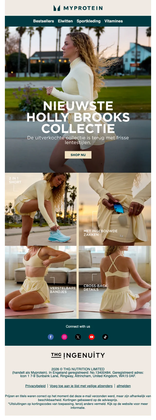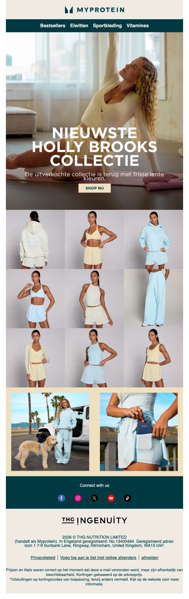 Je hebt de voeding, je hebt het schema, je hebt de ingesteldheid. Mis je nog iets? Sportkledij natuurlijk! Myprotein heeft hier een aparte sectie voor, vol met shirts en hoodies, broeken, leggings, topjes, shorts en andere sport wear. Ook accessoires zoals sporttassen, shakers, drinkflessen en beanies vind je hier. Inspiratie nodig? Dankzij het online look book shop je zo de perfecte gym outfit.