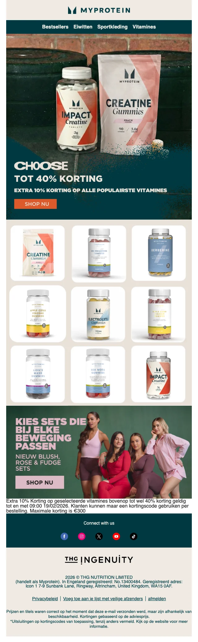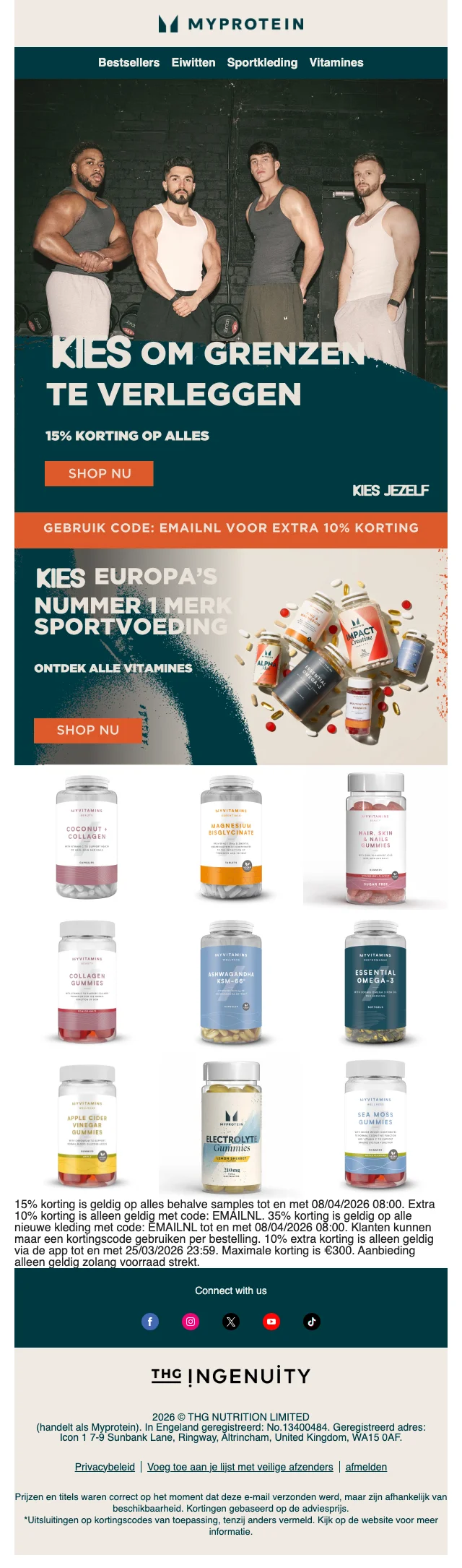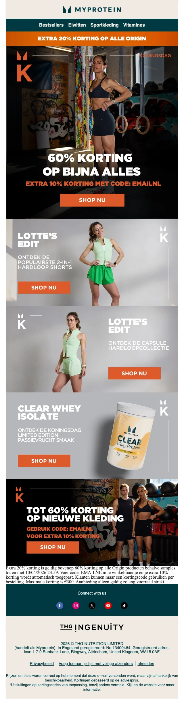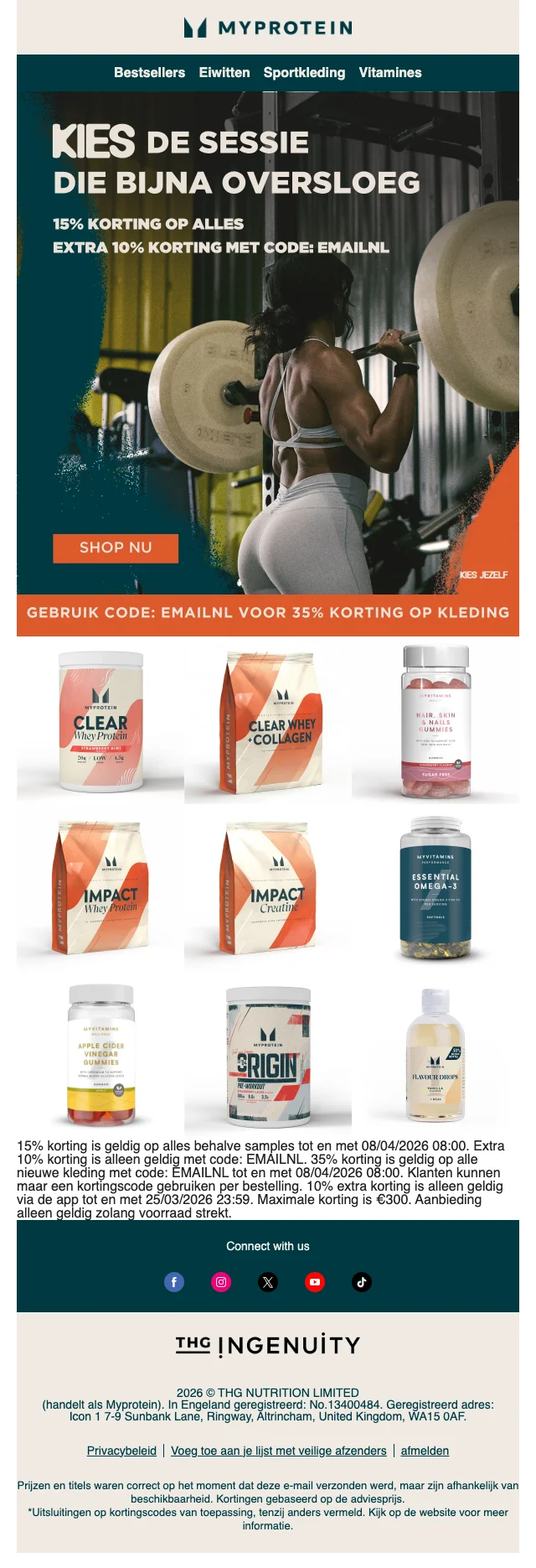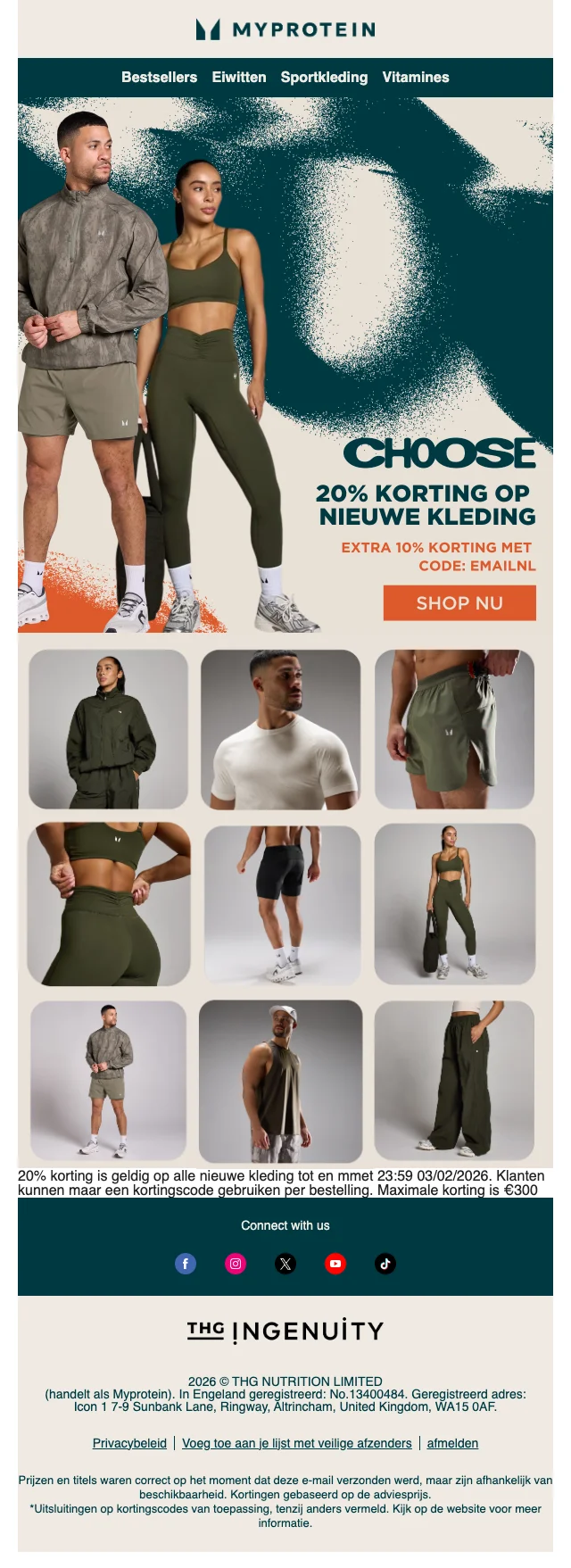 Je hebt de voeding, je hebt het schema, je hebt de ingesteldheid. Mis je nog iets? Sportkledij natuurlijk! Myprotein heeft hier een aparte sectie voor, vol met shirts en hoodies, broeken, leggings, topjes, shorts en andere sport wear. Ook accessoires zoals sporttassen, shakers, drinkflessen en beanies vind je hier. Inspiratie nodig? Dankzij het online look book shop je zo de perfecte gym outfit.
