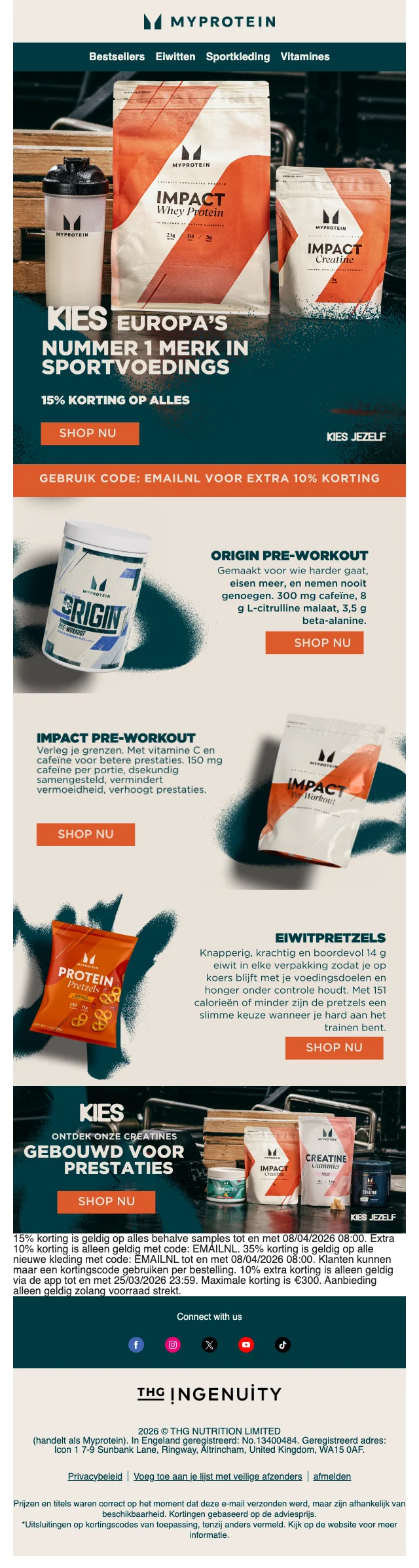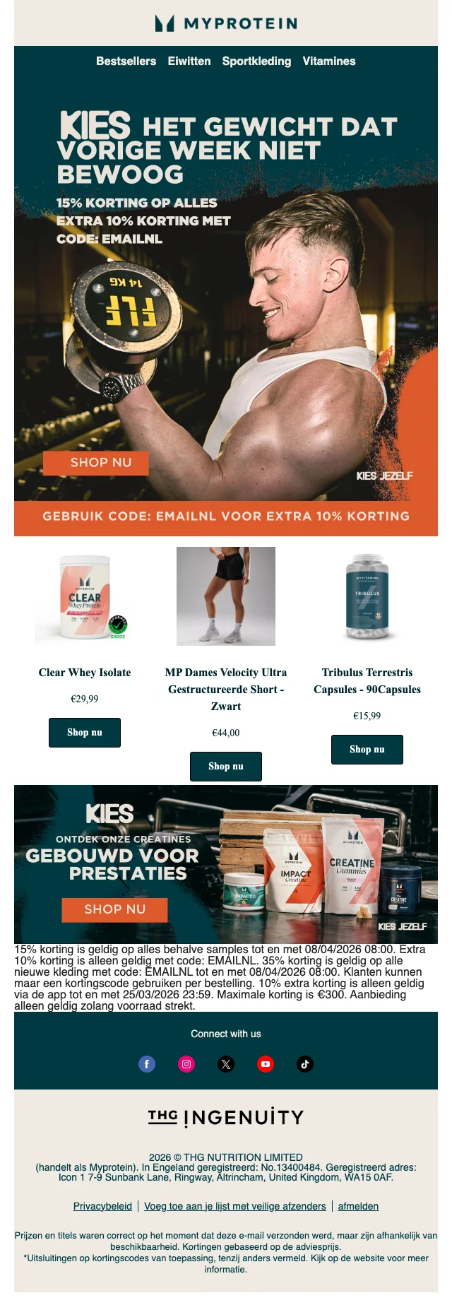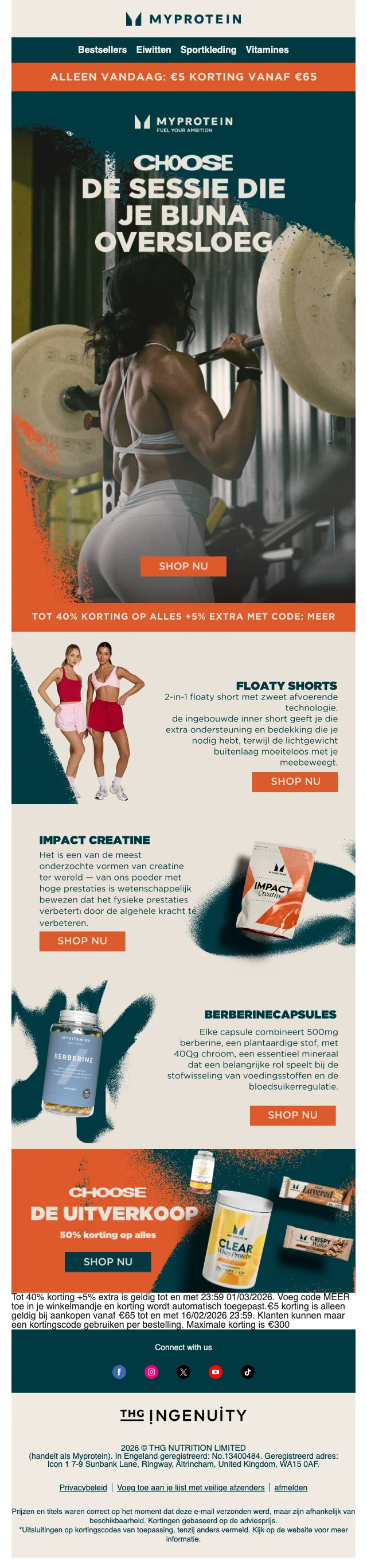 Myprotein heeft vaak speciale promoties om geld te besparen op je volgende bestelling. Vele van deze bevinden zich in het tabje 'aanbiedigen'. Hier zijn ook wekelijks wisselende aanbiedingen en maandelijkse promoties. Myprotein.com maakt gebruik van verschillende kortingscodes voor diverse soorten artikelen. Kijk welke Solden.be voor je klaar heeft staan en maak kans op grote kortingen. Geen spam, alleen gains!