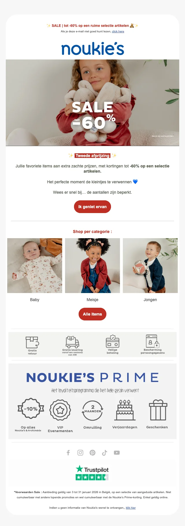 De Noukies outlet is de place to be voor geweldige kortingen op al onze topproducten. Hier vind je een enorme variatie, van schattige kleding tot het leukste speelgoed, allemaal tegen flink verlaagde prijzen. Deze kans mag je echt niet laten liggen, dus waar wacht je nog op? Duik in onze outlet en scoor nu de beste deals voor je kleintje!