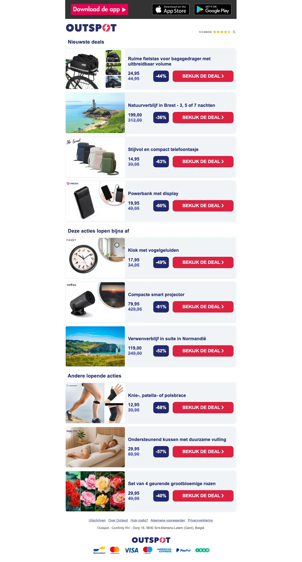 Bij Outspot zijn altijd leuke deals te vinden, soms voor reizen of een dagje weg, maar ook om lekker een keer uit eten te gaan. Deze deals worden ook wel de onweerstaanbare restaurantdeals genoemd. Dankzij deze deals kunt u goedkoop genieten van een heerlijke maaltijd op een gezellige locatie in een mooi restaurant. Denk bijvoorbeeld aan alle leuke restaurants in Antwerpen, Brugge of Brussel. Voor al deze plekken zijn vaak wel deals te vinden bij Outspot. Bekijk direct het gehele aanbod en ga ook voordelig uit eten!