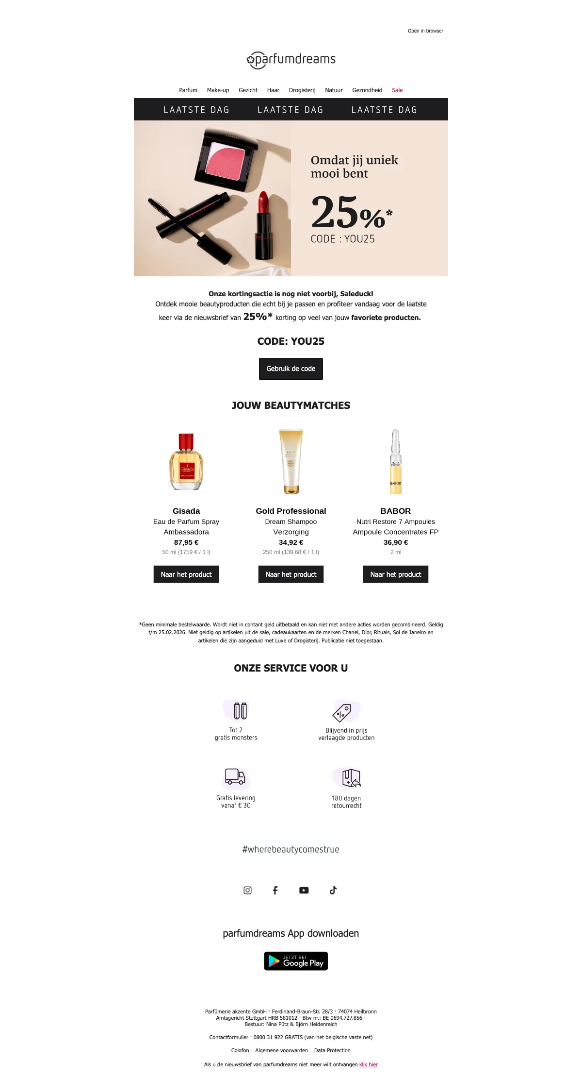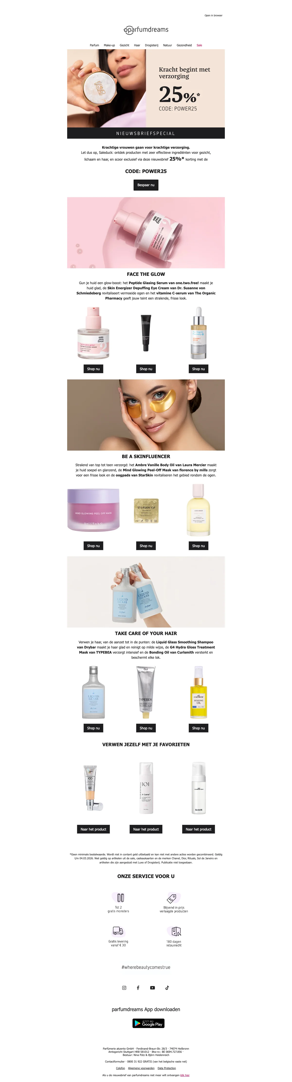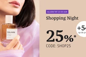 Ontvang 25% korting plus nog eens 5% extra op geselecteerde promotieproducten zonder minimale bestelwaarde. De actie geldt niet voor sale-artikelen, cadeaukaarten en merken als Chanel, Dior, Rituals en Sol de Janeiro en is niet te combineren met andere acties.