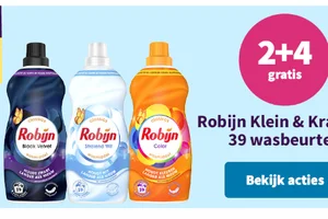 Pak 2+4 gratis op geselecteerde Robijn Klein & Krachtig wasmiddelen: koop 2 en ontvang 4 extra verpakkingen gratis, ideaal om de voorraadkast aan te vullen en minder vaak te kopen. Geldt alleen op geselecteerde varianten; prijs kan verschillen per combinatie.