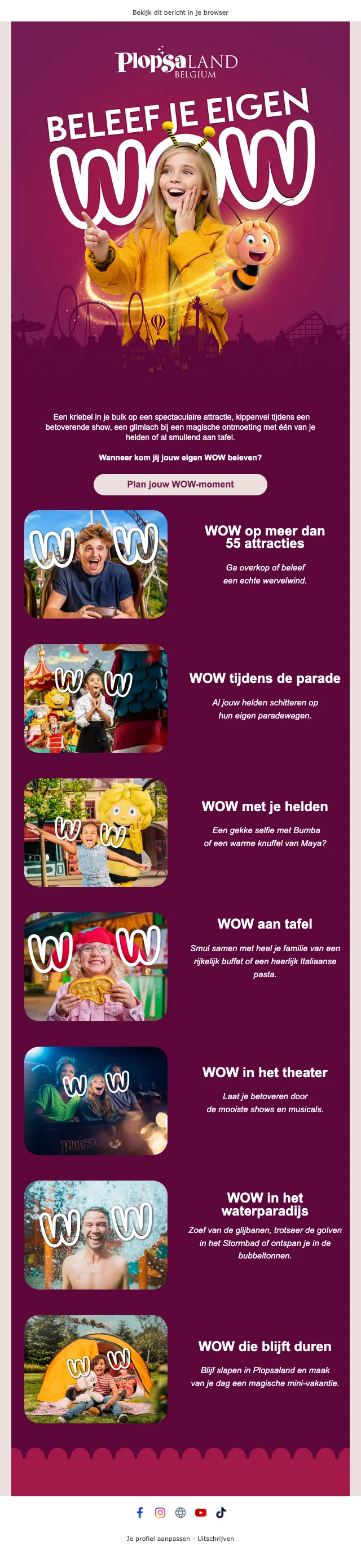 Zin in een spetterende zomer? Dan is het Plopsaqua park leuk voor jou! Hét waterpretpark van België. Een ruim aanbod van leuke glijbanen, binnen- en buitenbaden, en zelfs een discobad. Meer geinteresseerd in evenementen en muziek? Dan heeft Plopsa Theater leuke shows voor jou. Concerten met Vlaamse topartiesten, televisiesterren zijn er te zien, of grote shows als de Samson & Gert show. Zoek je meer een attractiepark belevenis, dan moet je een keer naar Plopsaland de Panne, het meest bezochte pretpark in België. Hier wordt de magie van Studio 100 gecombineerd met het plezier van meer dan 50 attracties voor jong en oud. Geniet van de spannende achtbanen, of ontmoet Amika, het paard van Merel uit de gelijknamige serie die in Plopsaland De Panne woont.