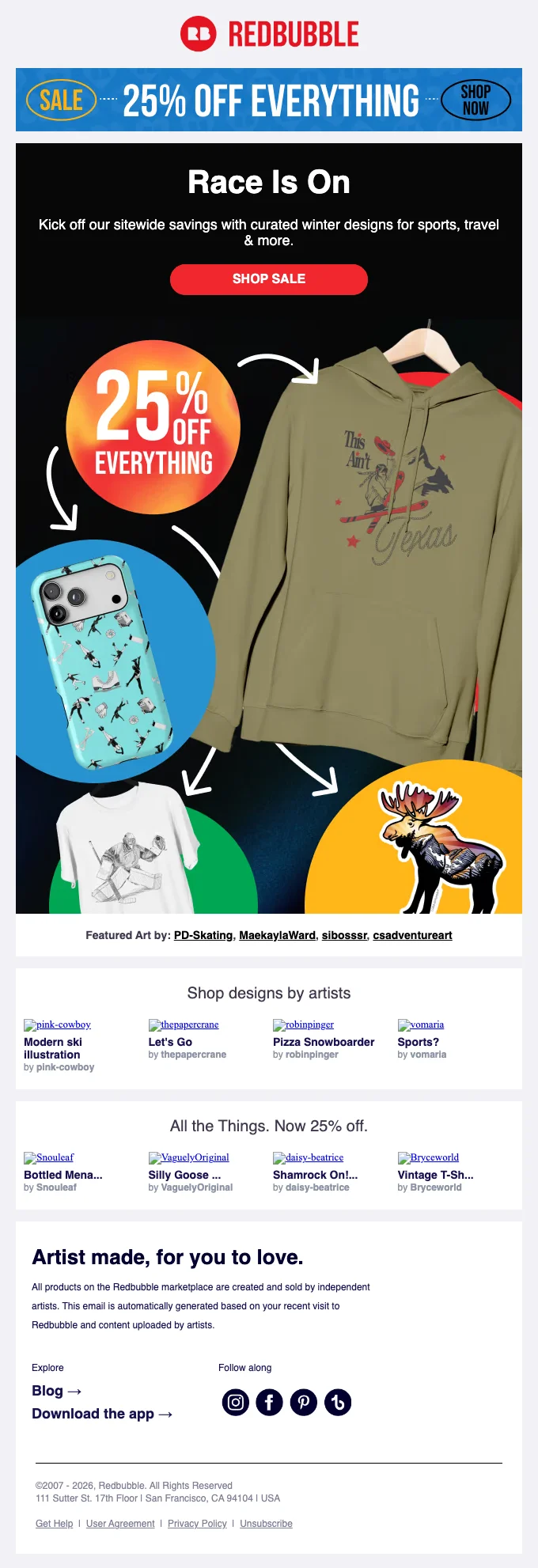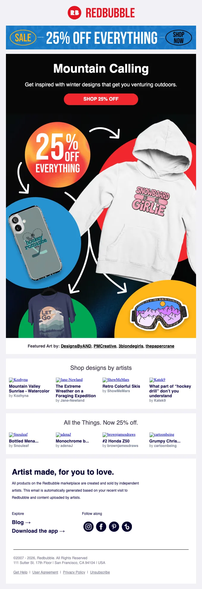 Profiteer van 25% korting op premium T-shirts, hoodies en meer; ideaal om unieke designs van onafhankelijke artiesten op kwaliteitsstoffen te scoren. Volgens de e-mail geldt de actie sitewide en op featured artist-made producten.