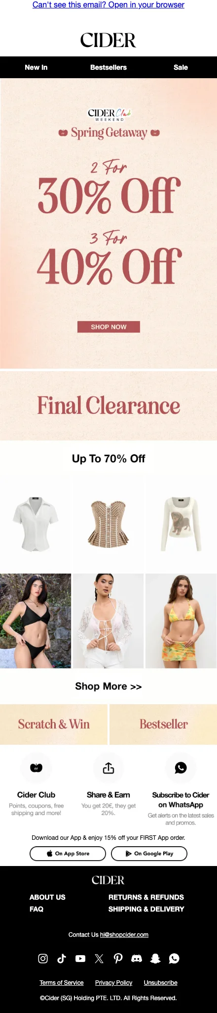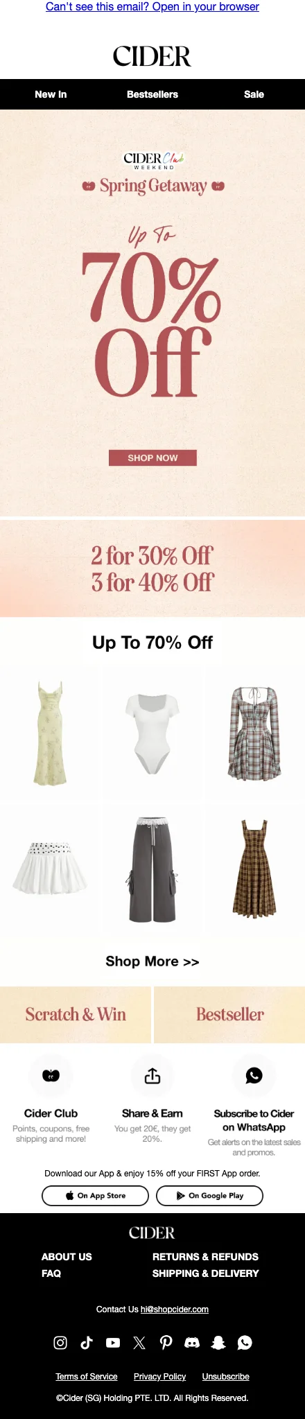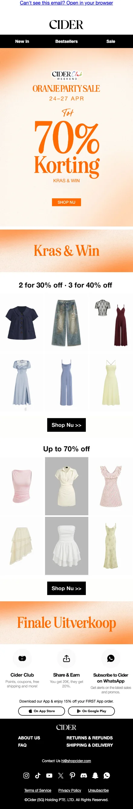 Profiteer van tot 70% korting op geselecteerde artikelen bij Cider. Bespaar op jurken, tops en basics kortingen verschillen per product. Shop snel en vind favoriete items voor veel minder.