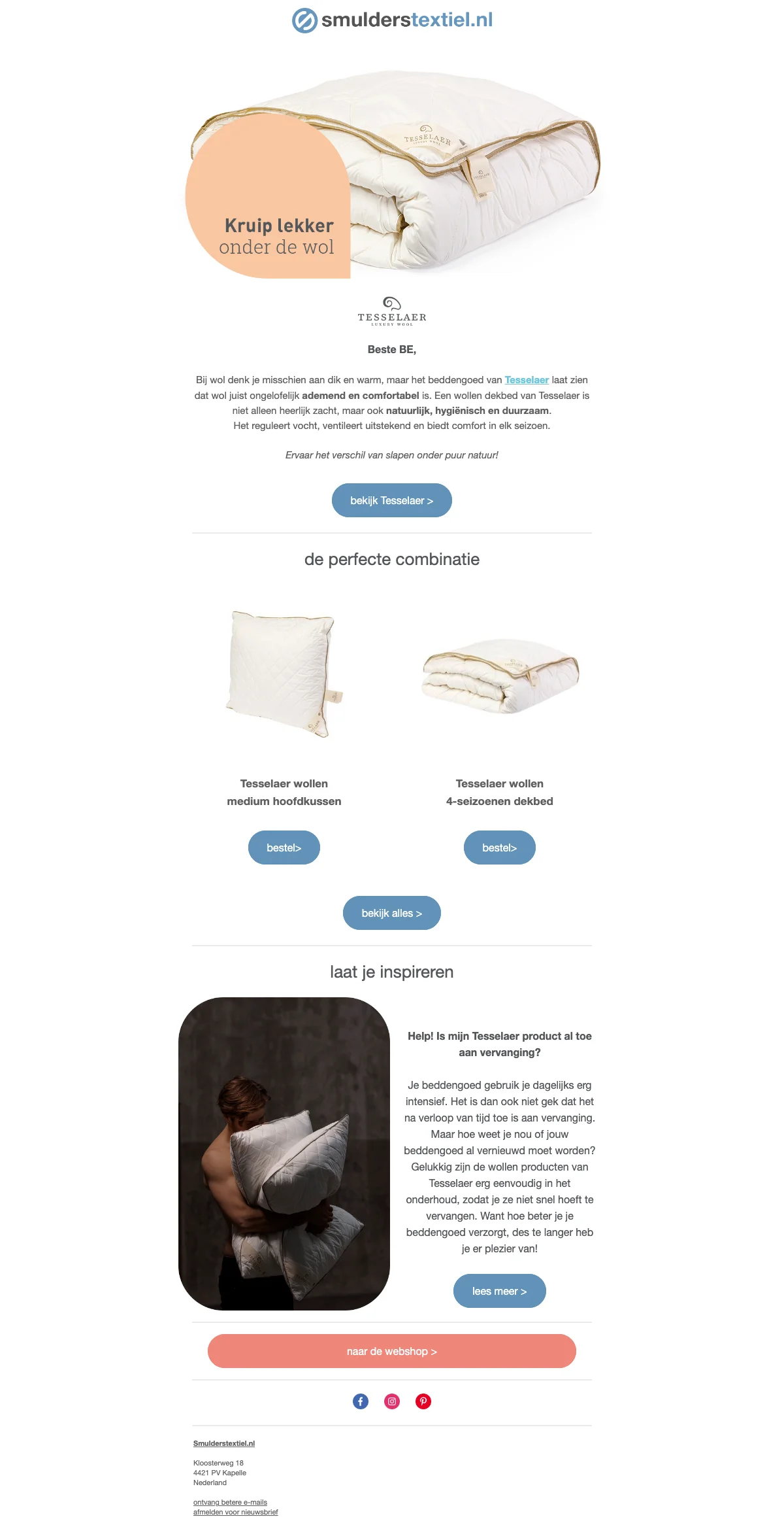 Smulderstextiel staat bekend om zijn focus op kwaliteit en duurzaamheid. De producten zijn gemaakt van hoogwaardige materialen die lang meegaan en bestand zijn tegen dagelijks gebruik. Hierdoor kunnen klanten vertrouwen op de lange levensduur en het comfort van hun aankopen.