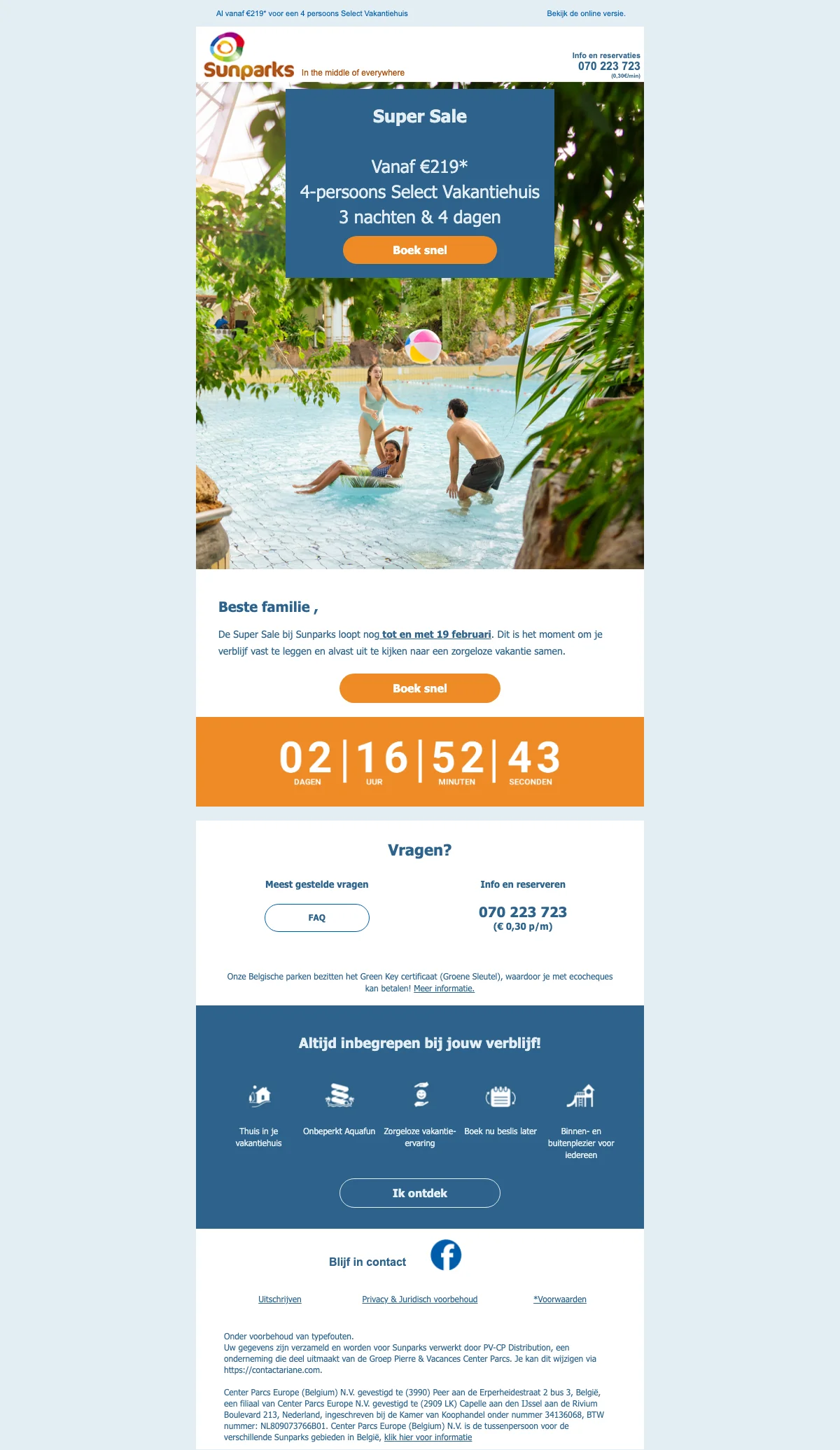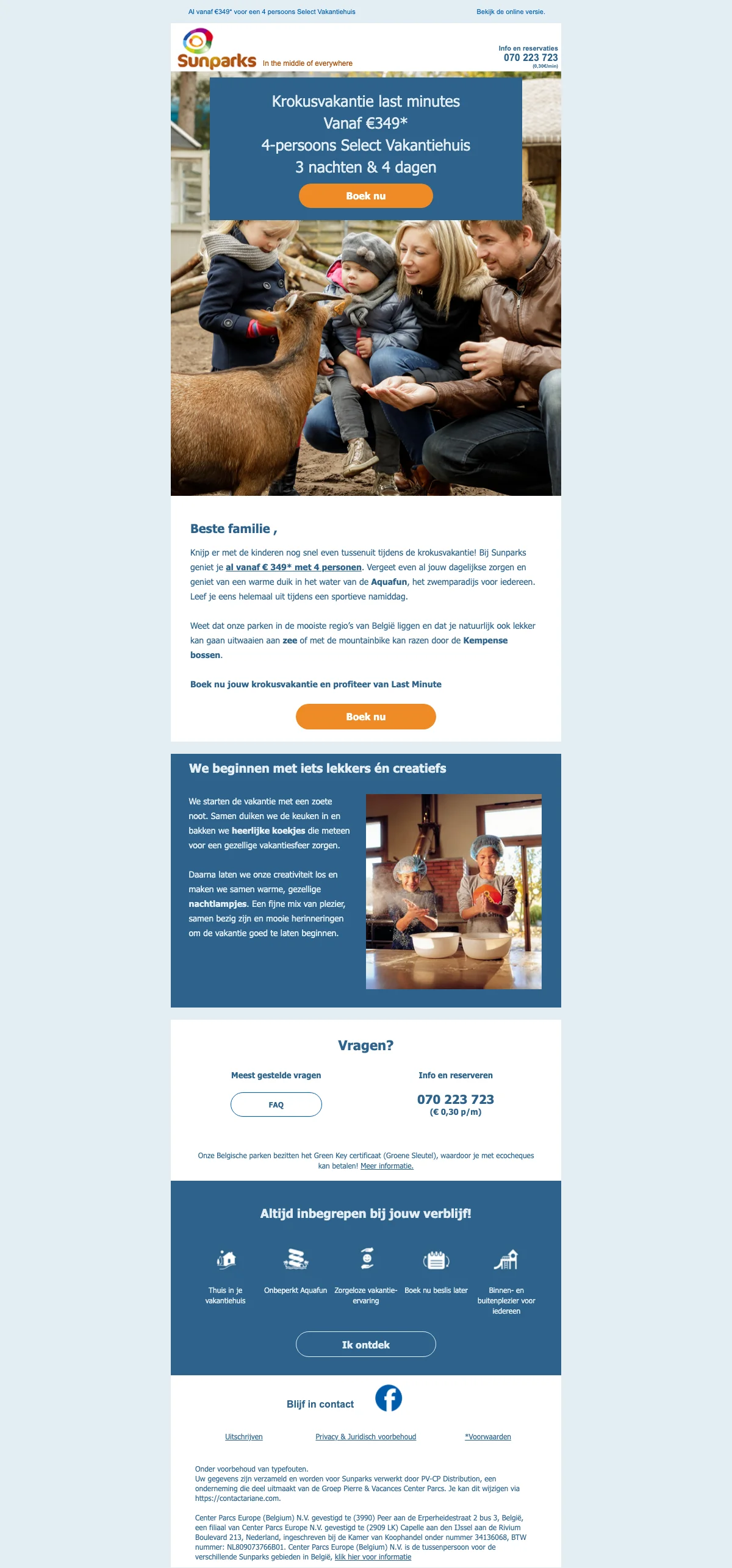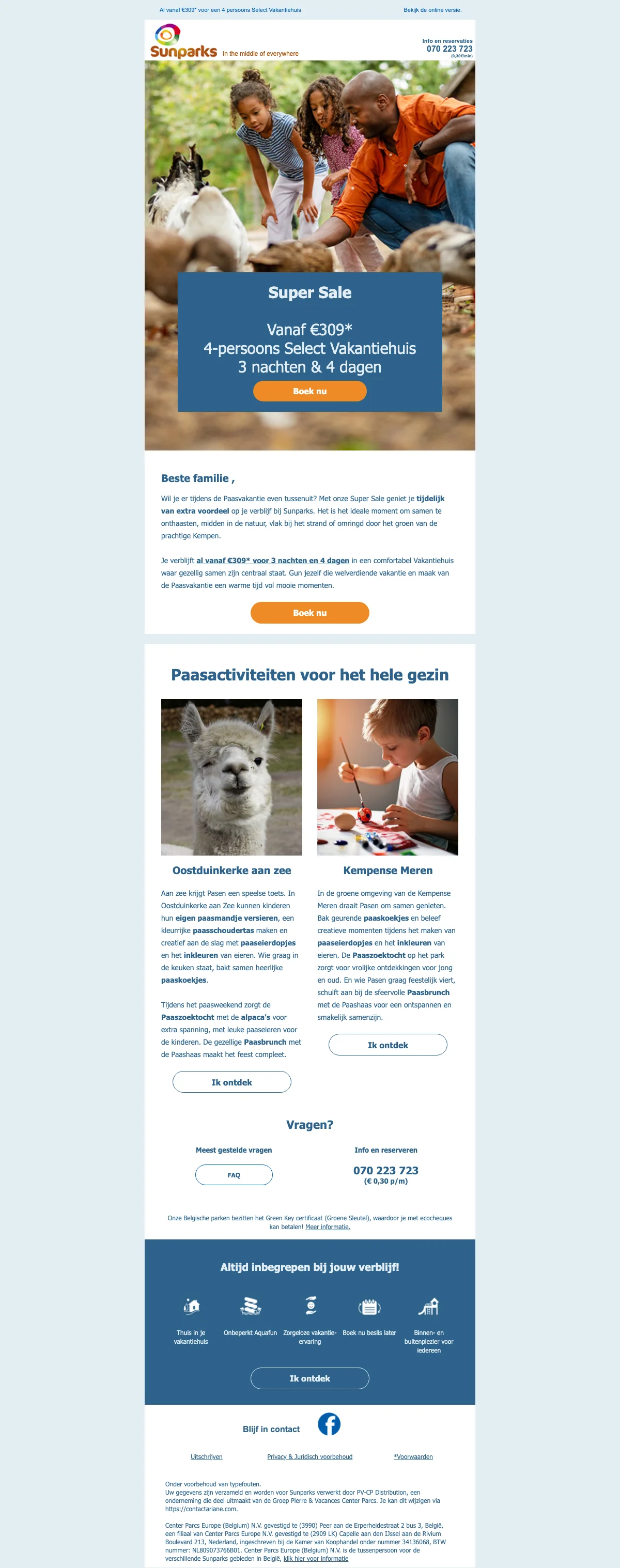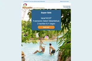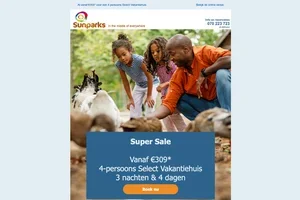Geniet van een voordelige voorjaarsvakantie bij Sunparks met Last Minutes vanaf €265 voor 4 personen, inclusief 3 nachten verblijf. Ontdek comfortabele vakantiehuizen, een zwemparadijs en talloze activiteiten midden in de natuur.