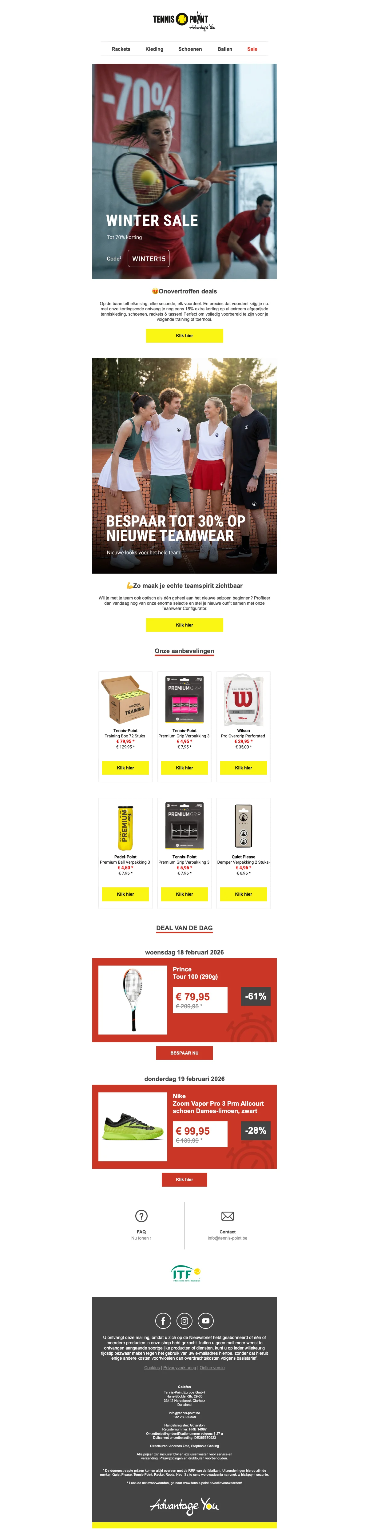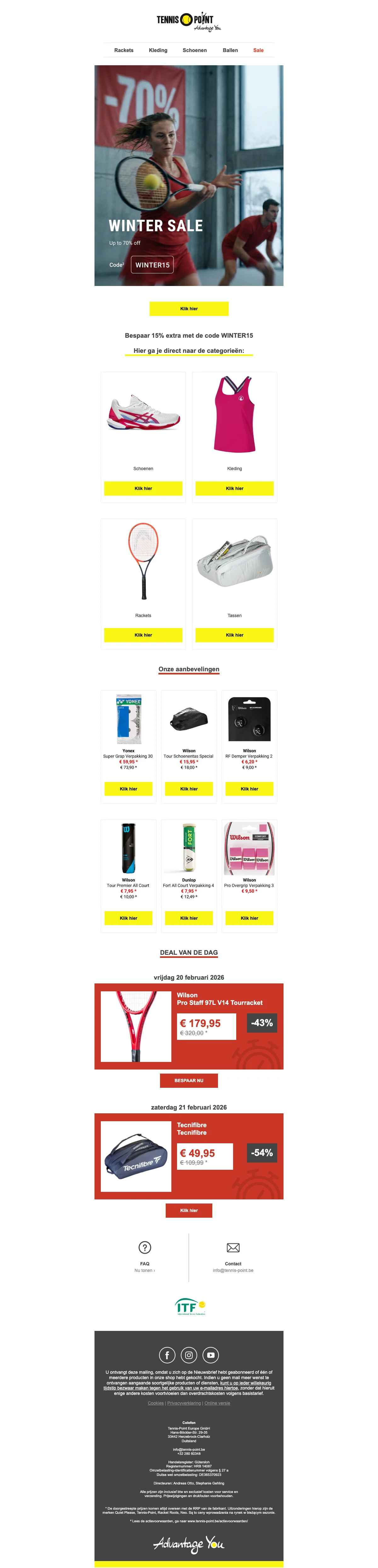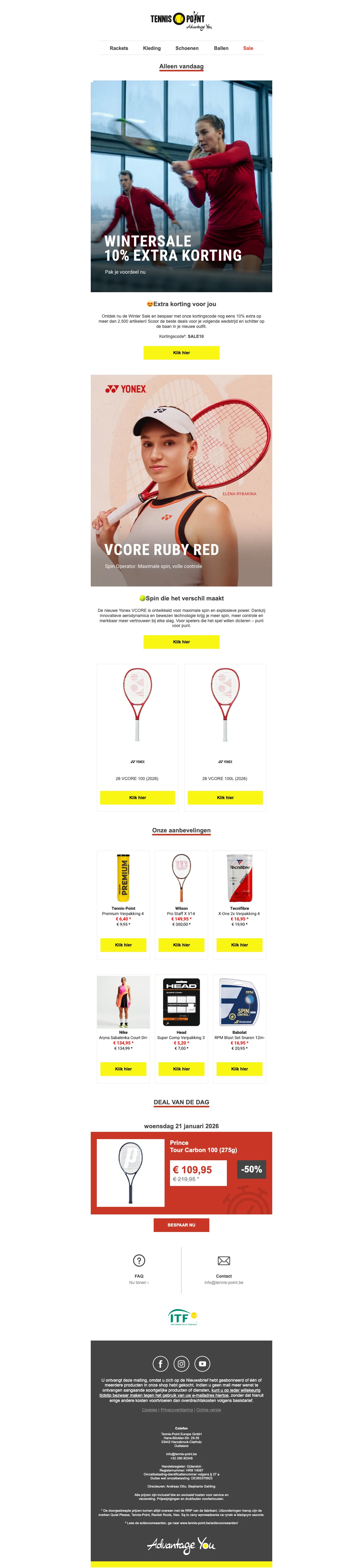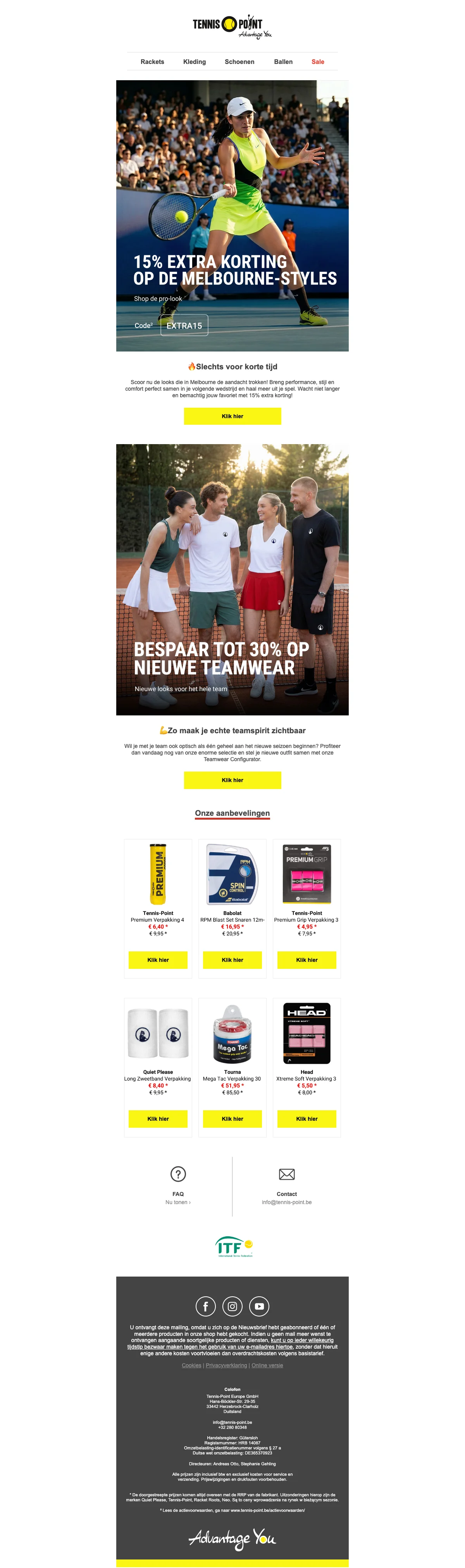 Ontvang 15% korting op een breed assortiment tennisartikelen, van rackets tot schoenen en accessoires. Perfect om materiaal voordelig te vervangen of je spel te upgraden met direct lagere prijzen. Korting wordt bij de kassa toegepast op geselecteerde items.