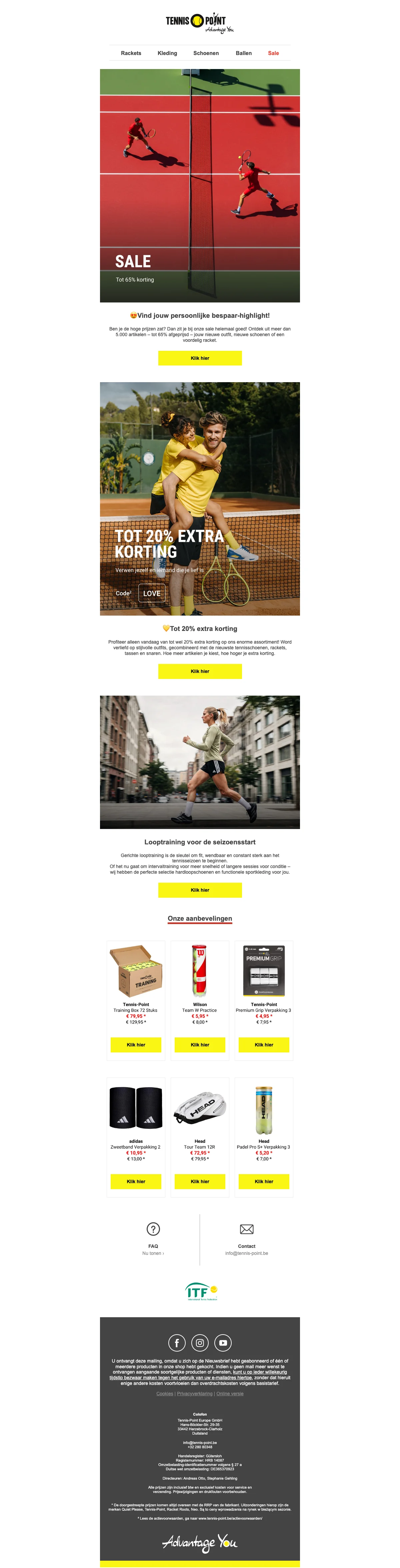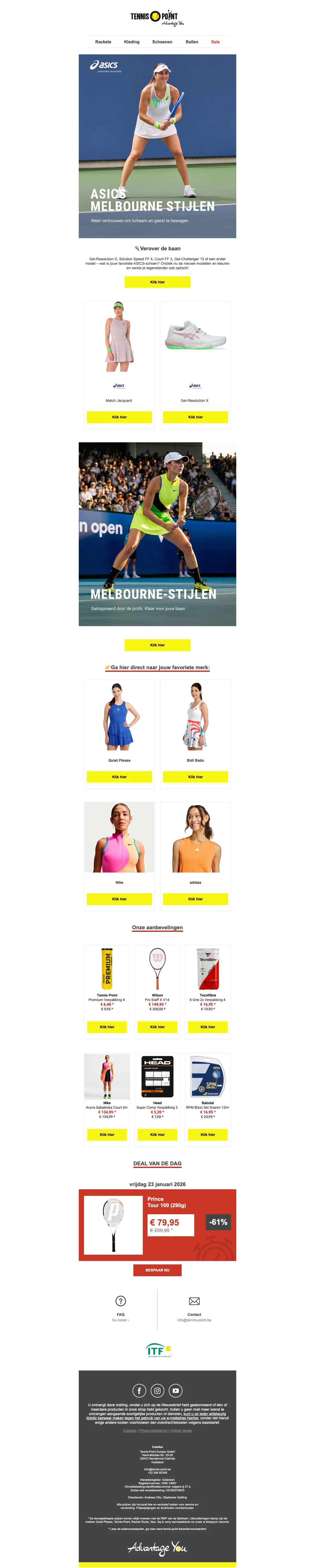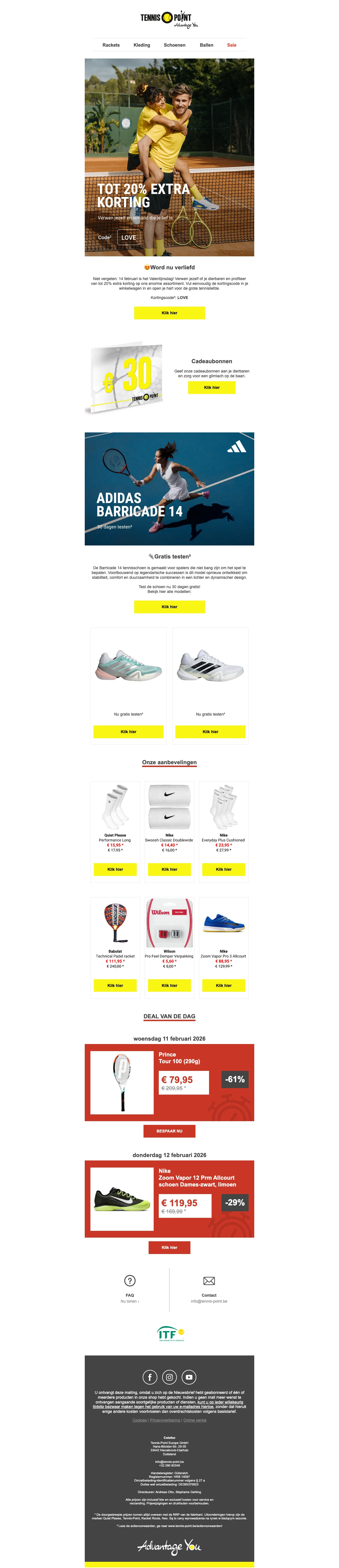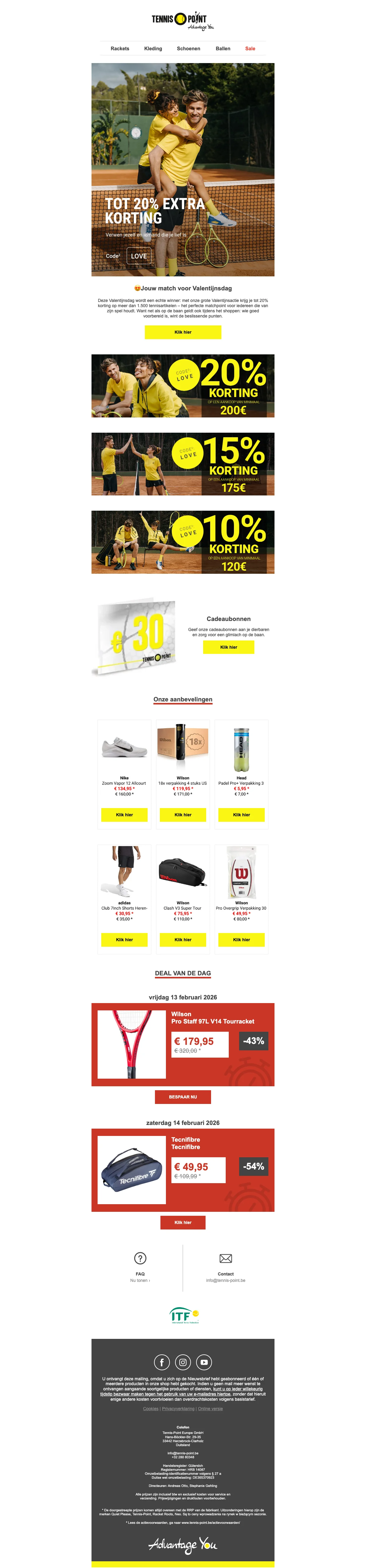 Ontvang 15% korting op een breed assortiment tennisartikelen, van rackets tot schoenen en accessoires. Perfect om materiaal voordelig te vervangen of je spel te upgraden met direct lagere prijzen. Korting wordt bij de kassa toegepast op geselecteerde items.