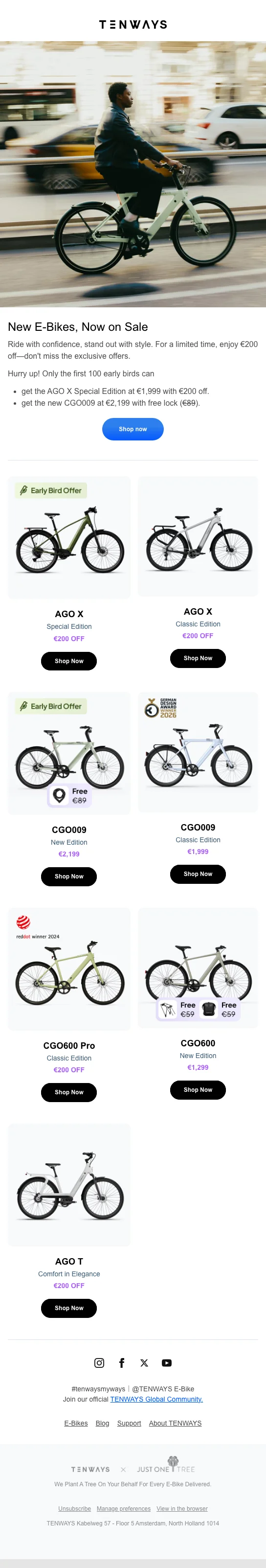Ontvang €200 korting op de AGO X en betaal nu €1.999; voordeel direct bij aankoop. Aanbod geldt alleen voor de eerste 100 kopers, dus wees er snel bij. Ideaal als je zoekt naar een hoogwaardige, lichte e‑bike voor dagelijks gebruik.