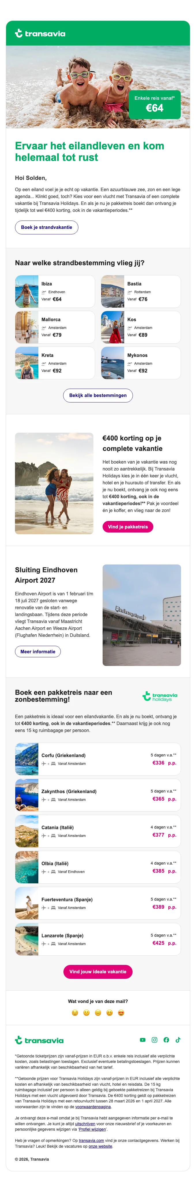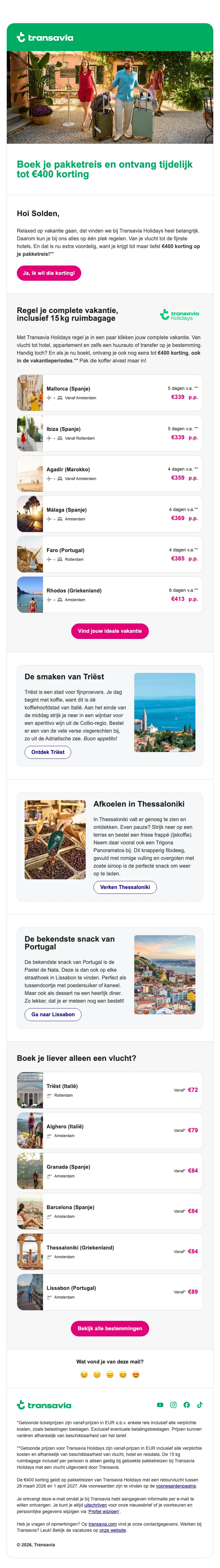 Transavia Holidays pakketreis korting tot €400 korting op reizen