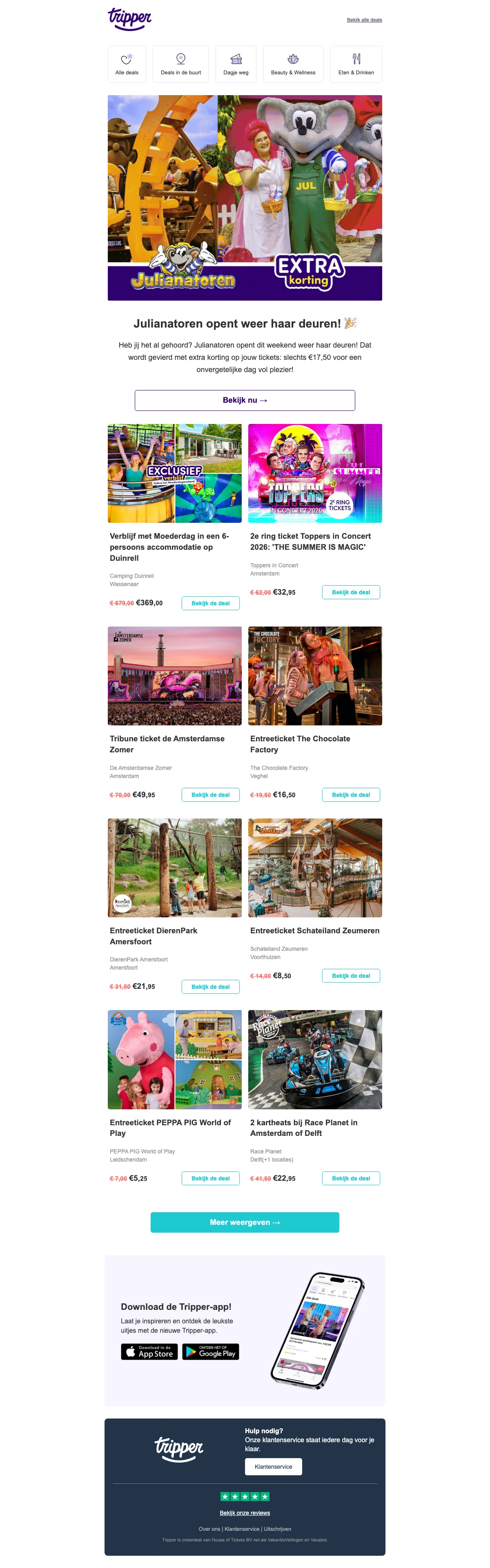 We monitoren Tripper aanbiedingen continu via de officiële website, partnernetwerken en nieuwsbrieven van de webshop. Nieuwe acties worden automatisch en handmatig gecontroleerd op geldigheid.