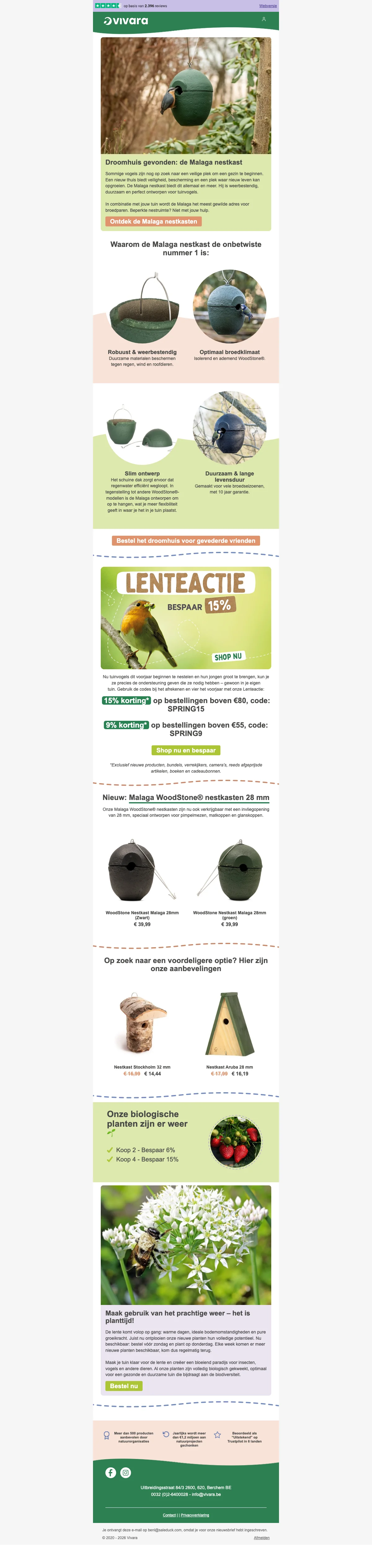 Vivara is al meer dan 10 jaar lang een specialist in diervriendelijke natuurbeschermingsproducten. Denk hierbij vooral aan vogels, maar ook aan andere leuke diertjes die in je tuin op bezoek komen zoals eekhoorns, egels of vossen. De producten in de webshop zijn speciaal ontworpen om dieren in comfort te voorzien en te verzorgen, zonder ze te storen of te doen schrikken. Vivara werkt samen met Vlaamse en Belgische organisaties zoals Natuurpunt en Vogelbescherming Vlaanderen om te zorgen dat hun assortiment aan alle voorwaarden voldoet om veilig te zijn voor dier en natuur.