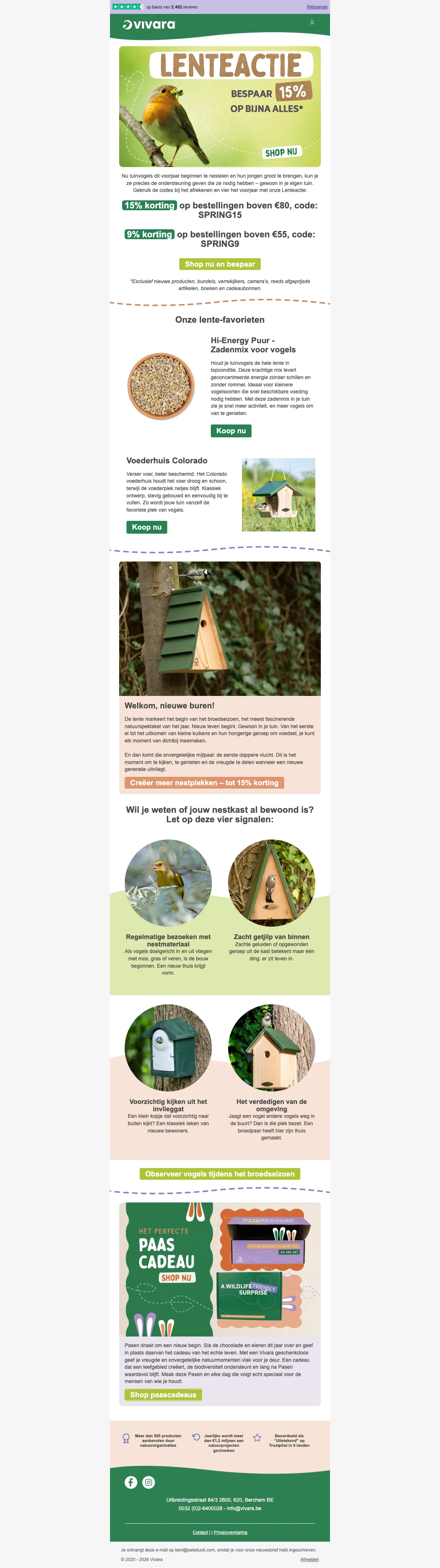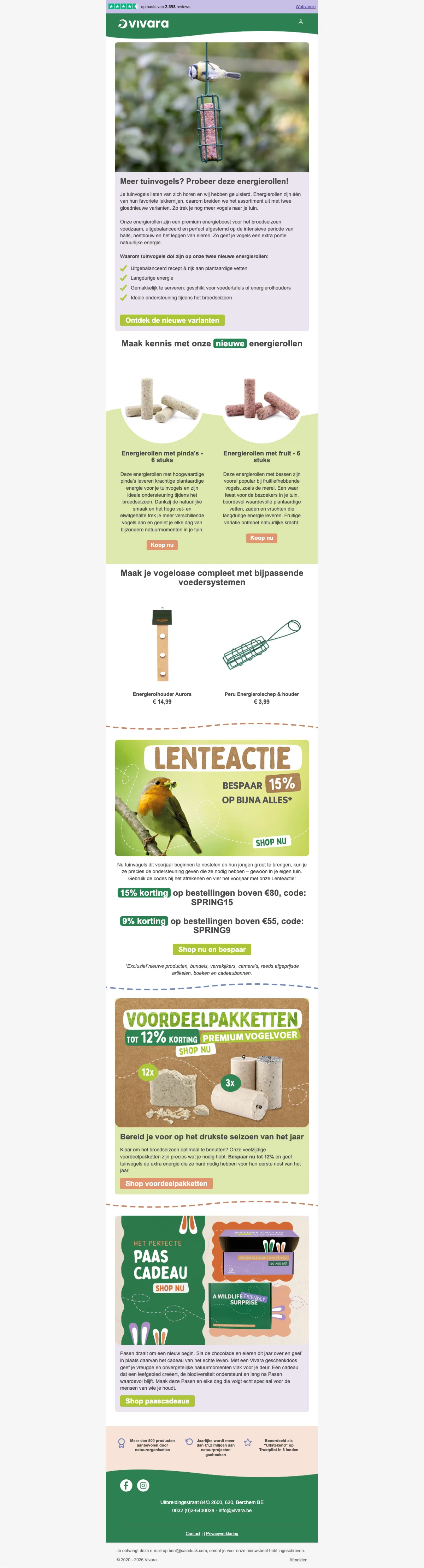 Vivara heeft aanbiedingen op haar website die iedere koopjesjager kunnen bekoren. Zo hebben ze speciaal samengestelde pakketten, bijvoorbeeld om de vogels te voeren. Wat dacht je van een voedersilo + silobeschermer met € 8 korting? Of een voedersilo en 1 kilogram zonnebloemkernen of andere zaden. Als we exclusieve codes voor Vivara hebben plaatsen we deze ook meteen online. Houd deze webshop pagina dus nauw in de gaten. Exclusieve aanbiedingen en promo's krijg je ook via de nieuwsbrief. Iedere maand zijn er nieuwe aanbiedingen, zeker in aanloop naar de winter.
