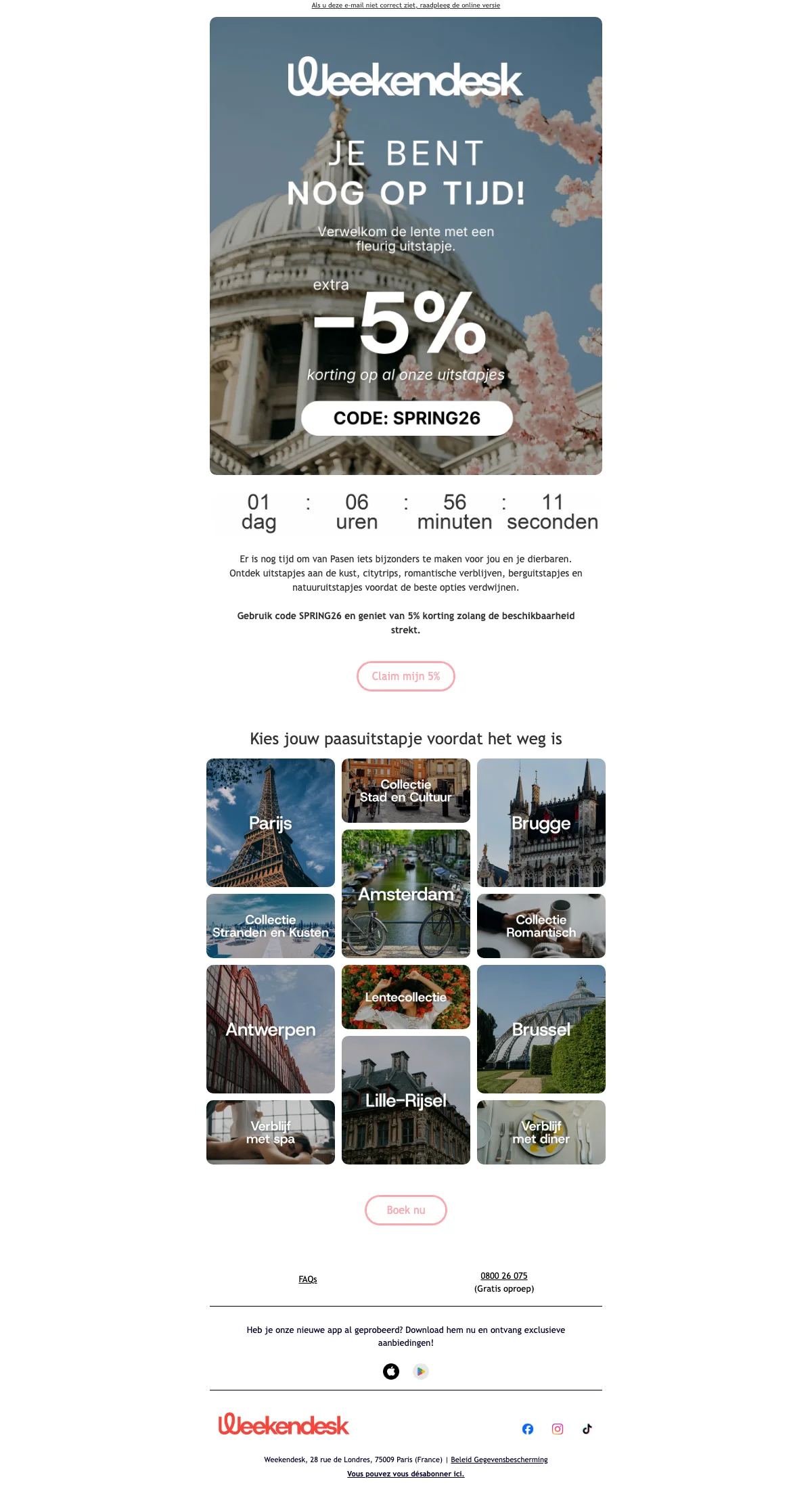 Reserveren bij Weekendesk werkt eenvoudig. Kies je bestemming, thema en datum, en doorloop het boekingsproces. Je betaalt €9,50 reserveringskosten per boeking bovenop de arrangementsprijs. Met creditcard, Bancontact of iDEAL kun je tot 1 dag voor vertrek boeken. Bij bankoverschrijving geldt een termijn van minimaal 3 weken.