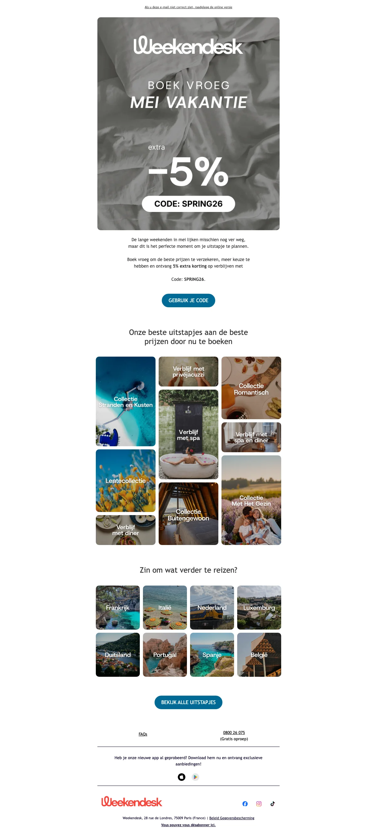 Heb je een kortingscode? Voer deze in op de betaalpagina in het veld onder annuleringsverzekering. Codes zoals WEWELL26 geven €10 korting op spa-uitstapjes vanaf €150 besteding. Kortingscodes zijn niet te combineren met andere acties tenzij anders vermeld.