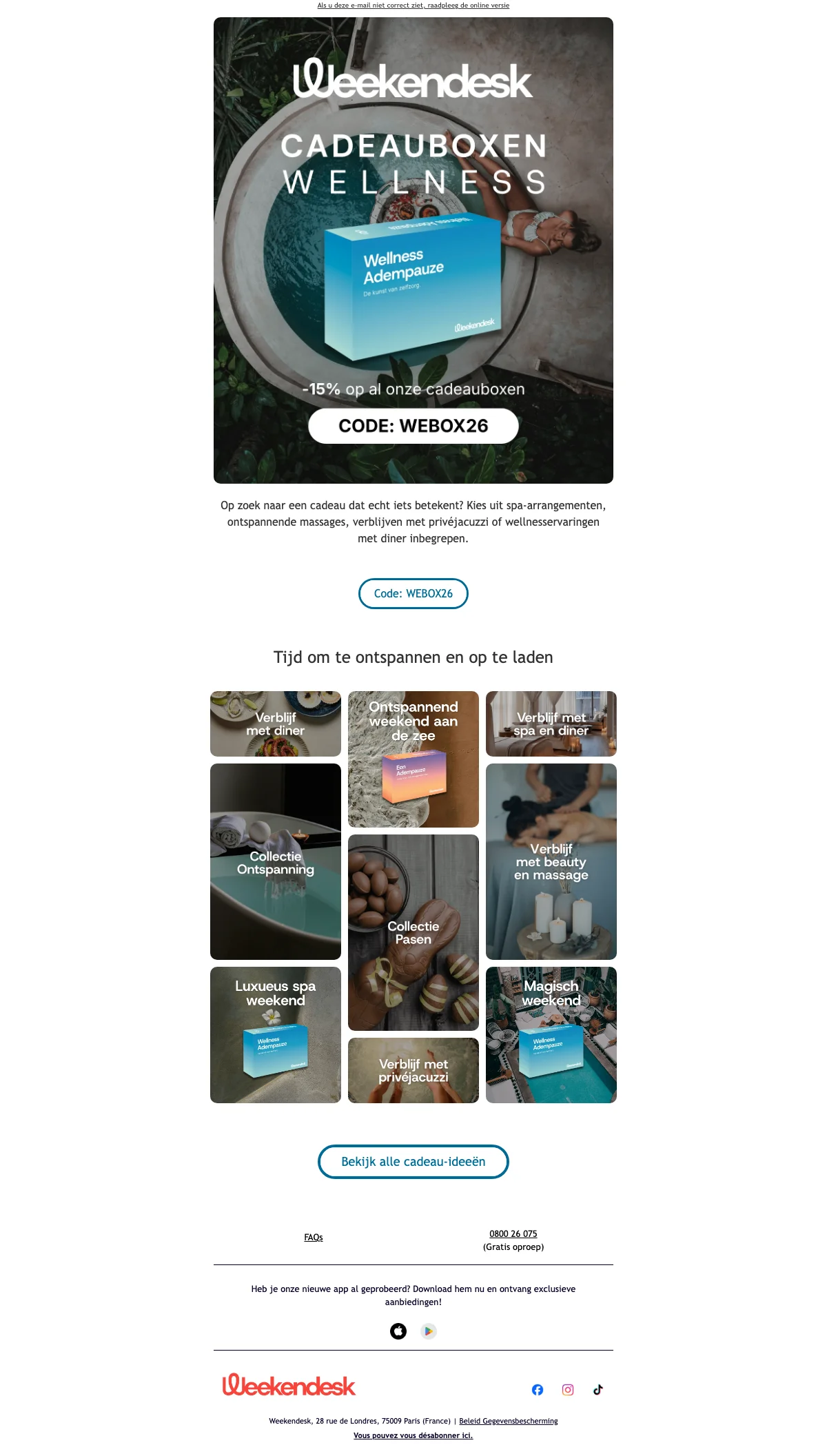 Je ontvangt de digitale versie direct per e-mail of de fysieke geschenkdoos binnen 1 tot 3 werkdagen. Verzending is gratis naar België, Nederland en Luxemburg. Met de code WEBOX26 ontvang je 10% korting op alle geschenkdozen.