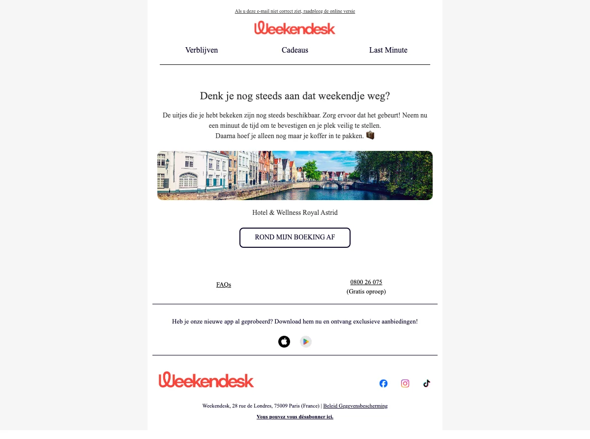 De meeste Weekendesk verblijven kun je gratis wijzigen of annuleren met terugbetaling van 80% tot een bepaalde datum, meestal 2 dagen voor vertrek. De exacte annuleringstermijn wordt getoond tijdens het boeken en staat in je bevestigingsmail onder "Mijn reservering beheren". De reserveringskosten van €9,50 worden niet terugbetaald.