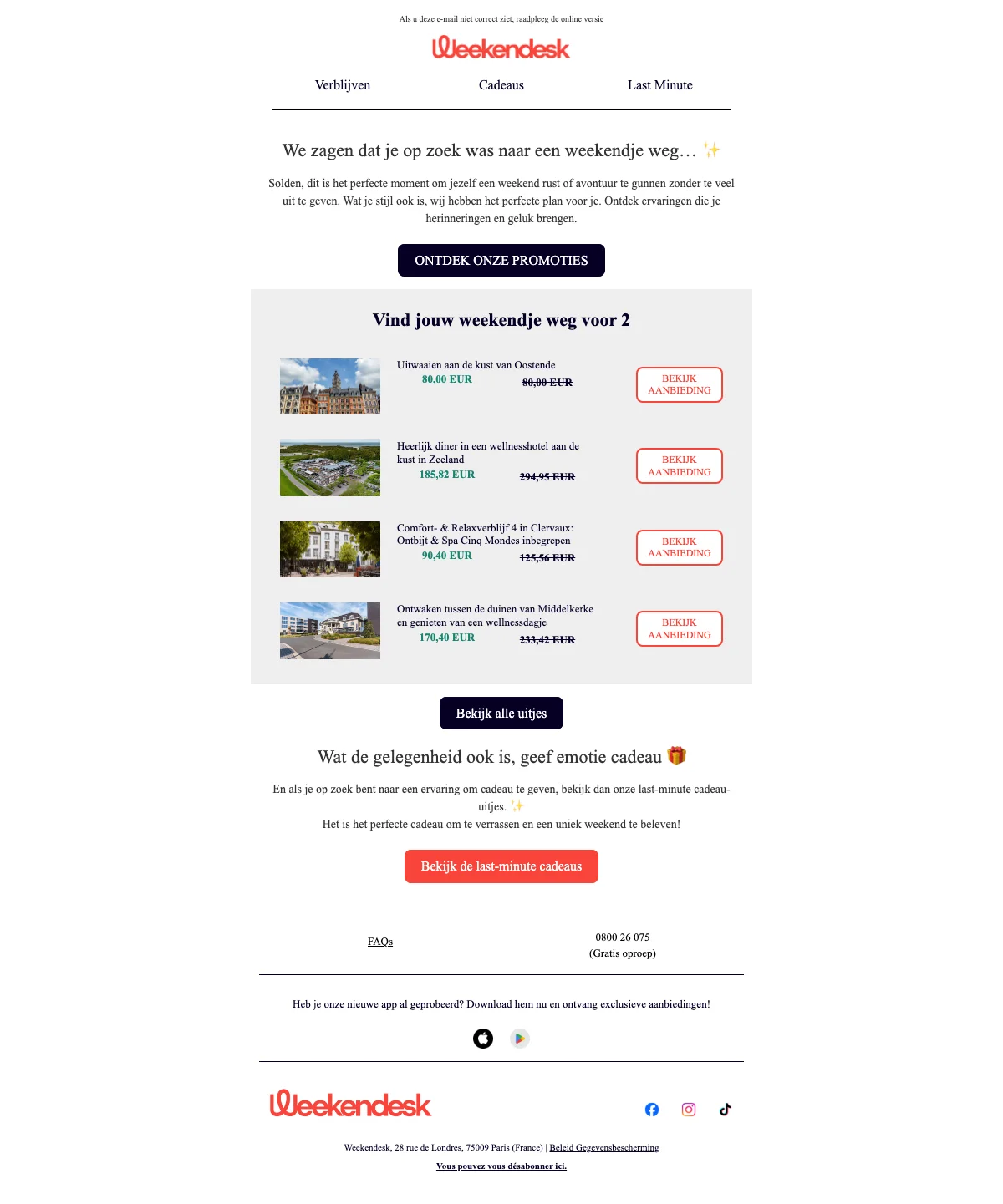 De verblijven zijn beschikbaar in verschillende thema's: spa-weekends, romantische uitjes, gastronomische ervaringen, citytrips en bijzondere overnachtingen zoals boomhutten of kastelen. Prijzen starten vanaf €60 voor een verblijf met spa en vanaf €120 voor romantische arrangementen met diner. Met de regelmatige flashsales scoor je kortingen tot 50% op geselecteerde bestemmingen.