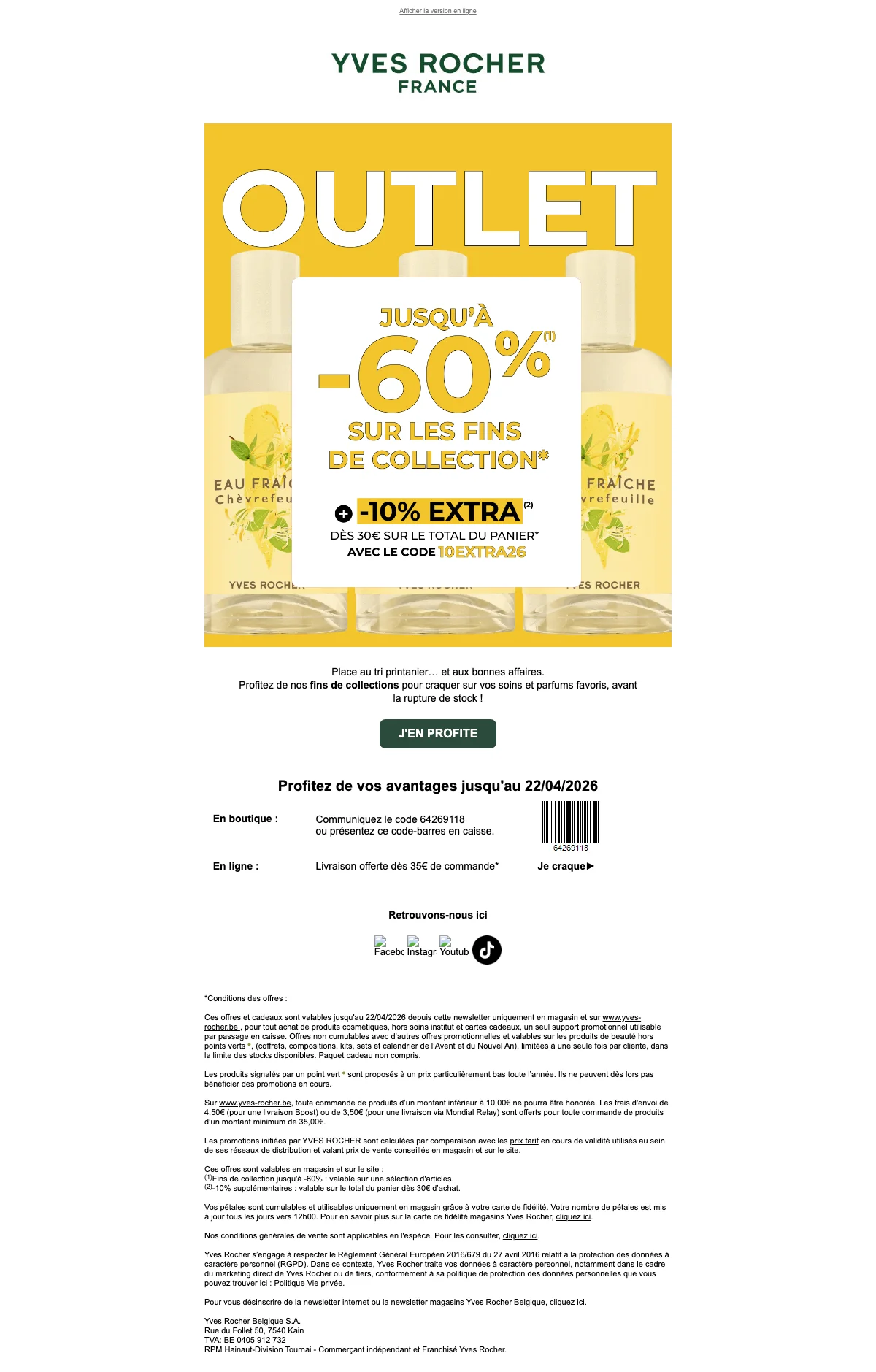 De werkende Yves Rocher kortingscode is 10EXTRA26. Vul deze promocode voor Yves Rocher 2026 in op de afrekenpagina en ontvang exclusieve kortingen. Yves Rocher Golden Days 50% korting en 10% extra bij aankoop.